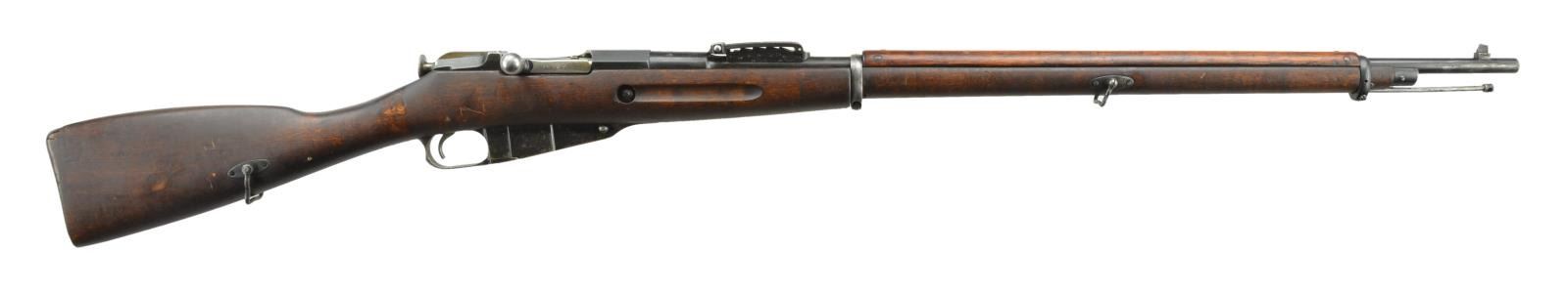 THREE LINE BOLT ACTION RIFLE. Cal.7.62x53R. S# 48694. After the Winter War of 1939-1940, Finland captured a significant number of Soviet rifles. The Tikka arsenal reworked model 1891 rifles giving them newly made bbls. & birch stock sets, while recycling as many parts. CAI import marked 31.6" bbl. w/ stepped front sight, Russian rear sight remarked from archins & 1943 date. Re-purposed Imperial marked 1891 hex receiver, mag. assembly, cleaning rod, buttplate & upper handguard. Birch stock has sling swivels. UNATTACHED ACCESSORIES: spike bayonet. CONDITION: good to very good overall condition as arsenal refinished. Good metal w/ marks & mag. assembly turning brown patina w/ pitting. Very good wood w/ marks throughout, a deep gouge on left side forearm & an inlet wood repair to stock around rear sight. Very good bore w/ strong rifling. (22-716/MD). CURIO.$300-400.