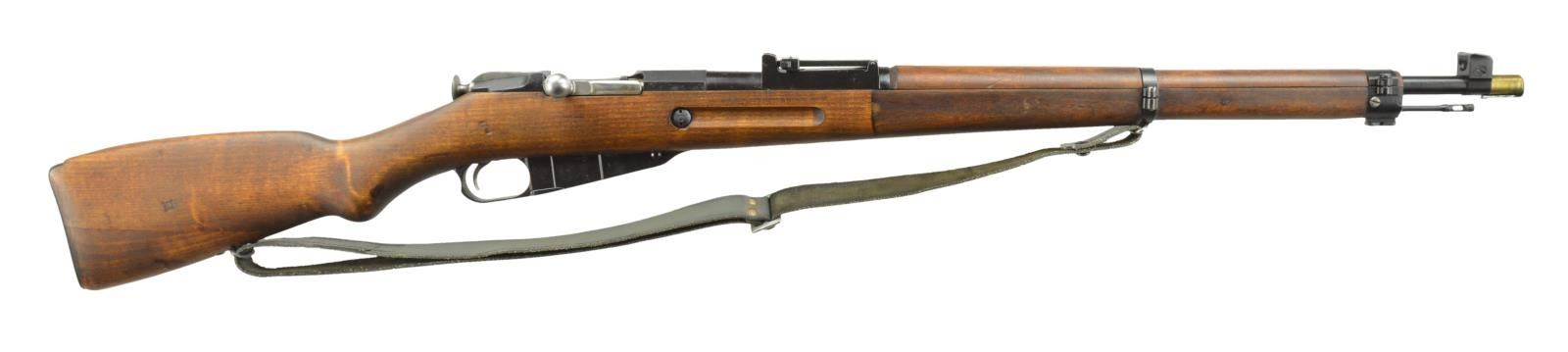 Cal. 7.62X53R. S# 35067. CAI import marked 27" bbl. w/ protected blade front sight & 2,000m ladder rear sight. Rifle consists of Russian hex receiver, mag. assembly & buttplate assembled w/ a VKT 1941 dated bbl. & 2 piece birch stock. Stock has cleaning rod, unique hinged front band w/ bayonet lug, bottom & side swivels holding a green colored sling. Matching numbered bbl. & bolt. Right side of buttstock has "L" depot stamp. UNATTACHED ACCESSORIES: brass muzzle cover. CONDITION: very good overall as factory refinished w/ wear & marks. Reblued over prior pitting on receiver & mag. assembly. Buttplate has noticeably worn appearance. Very good bore. (22-719/MD). CURIO. $300-400.