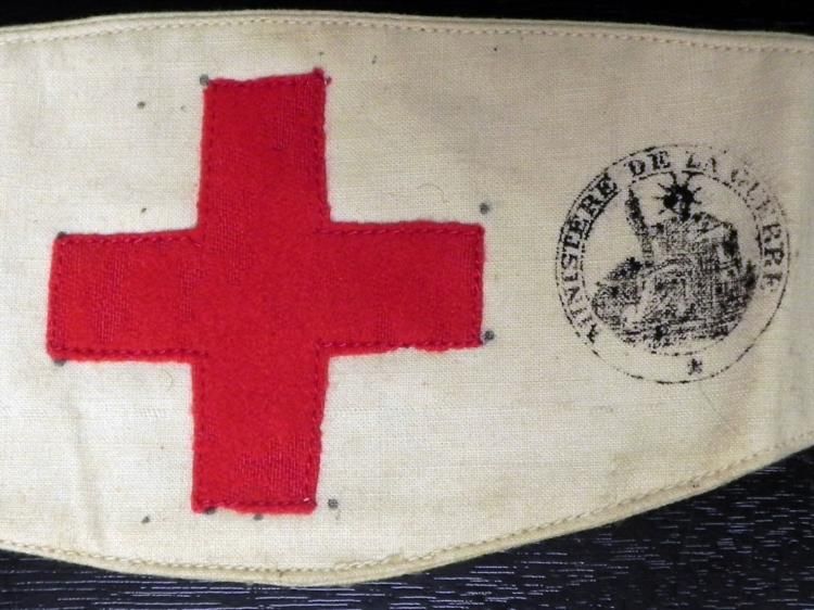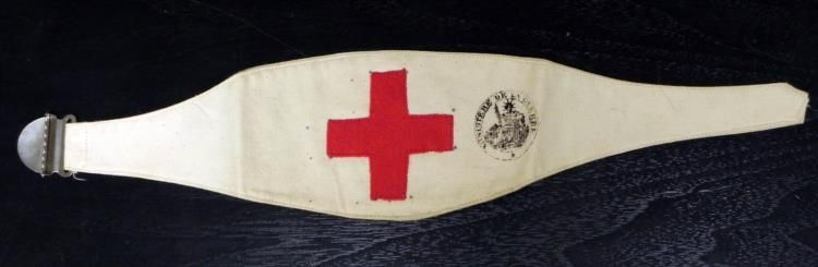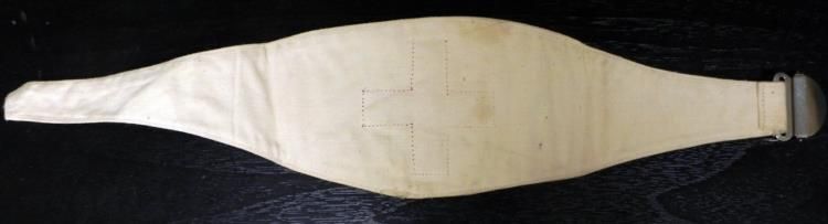 HERE IS A NICE, HARD TO FIND ORIGINAL RED CROSS SEWN ON OFF-WHITE ARMBAND WITH OFFICIAL MINISTRY OF WAR INK STAMP--BUCKLE & STRAP CLOSURE