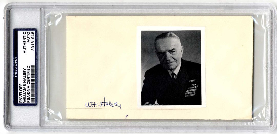 Bill Halsey photo display signed. The WWII Fleet Admiral signs ''W.F. Halsey'' to an envelope, upon which is affixed a small photo of Halsey. Small chip not affecting signature, very good condition. Encapsulated by PSA.