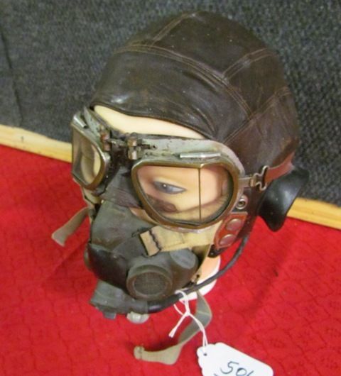 WWII Leather Flight Helmet with Goggles and Air Mask marked Airmed