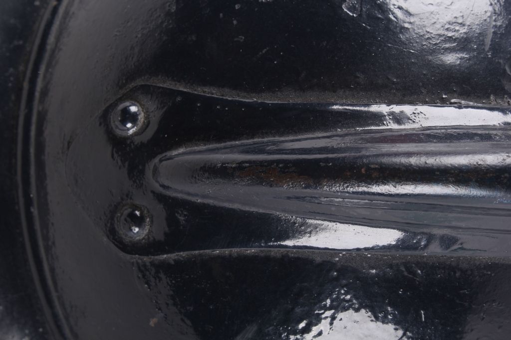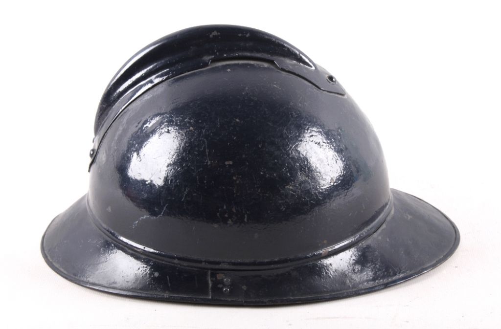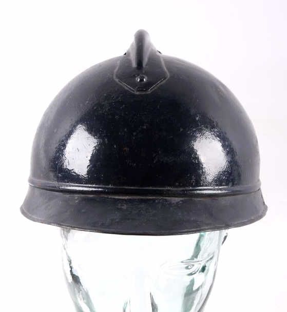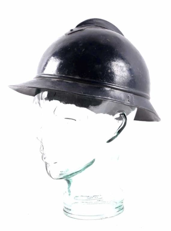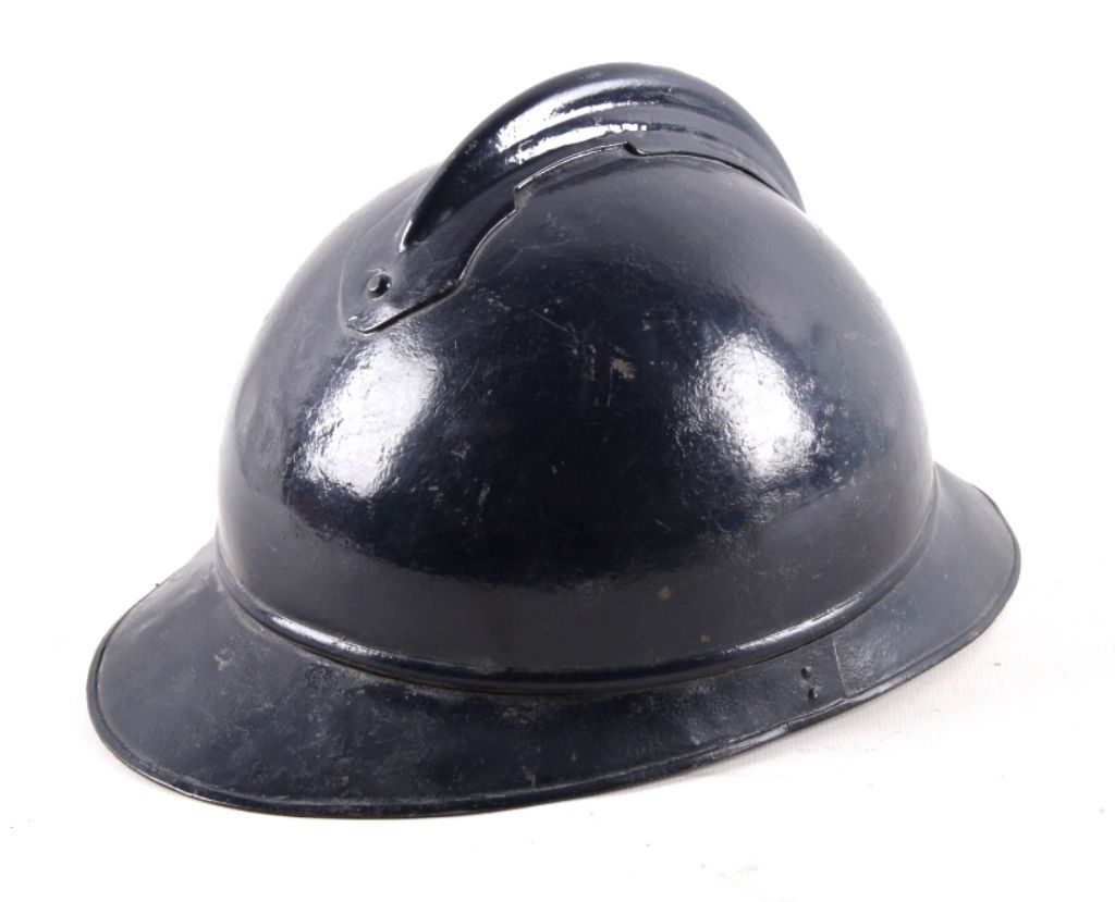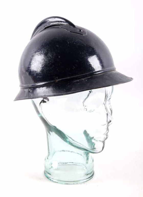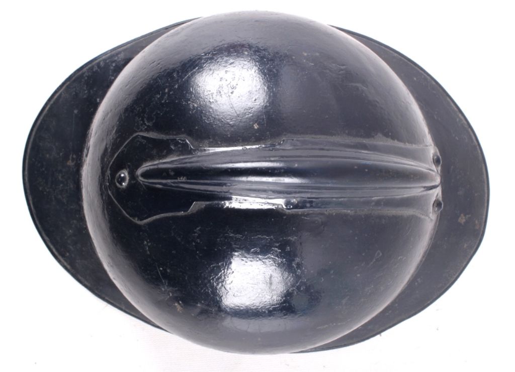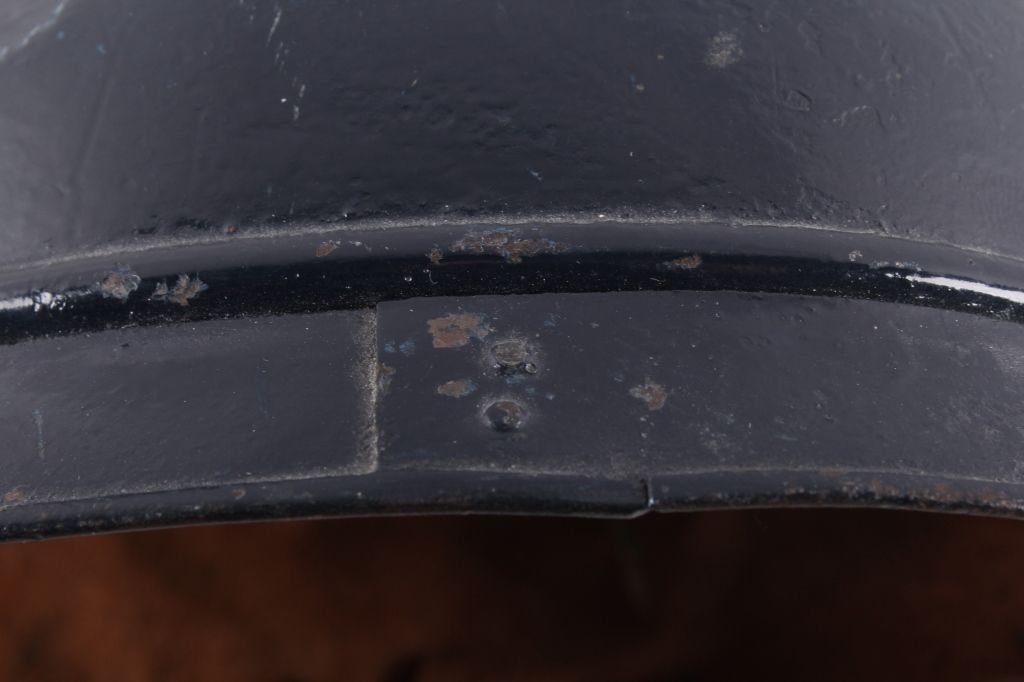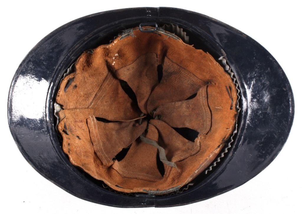 This is an original World War II cavalry metal helmet with a blue coloring. This is a M15 and M26 crossover helmet showing an overall good condition and rare deep blue coloring. The helmet has the Adrian style and shows the leather headliner.