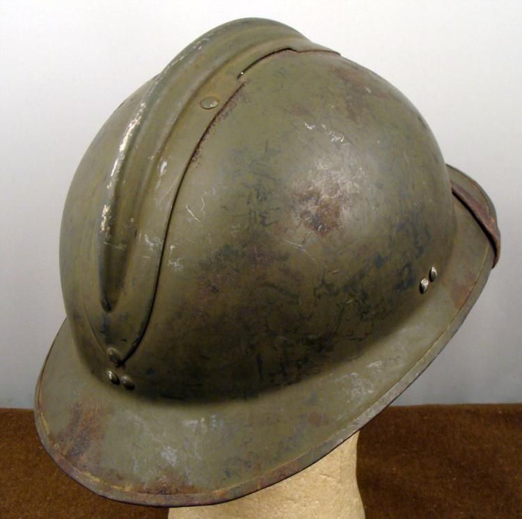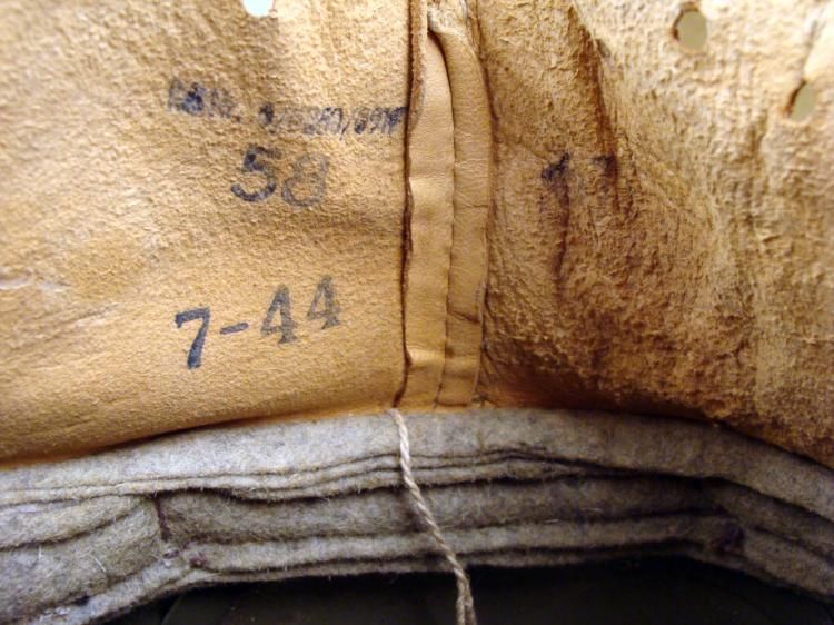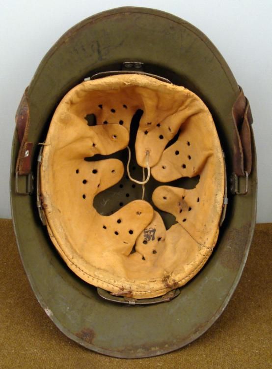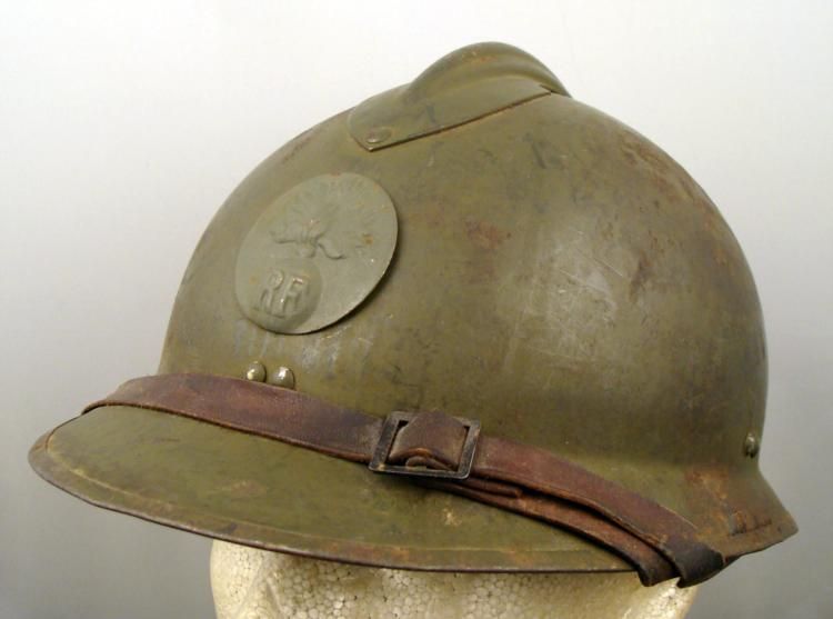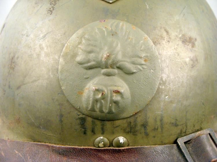Here is WWII era French Adrian helmet with Artillery Insignia. The badge has a raised image with RF, and ridge across the top. There is a leather strap that goes across the brim. The interior has a leather lining, with wool felt padding underneath. The lining is stamped with numbers, including 57, 58, and 7-44. The condition is very good overall. The dimensions are 8 3/4 x 12 1/4 inches.