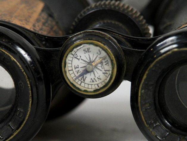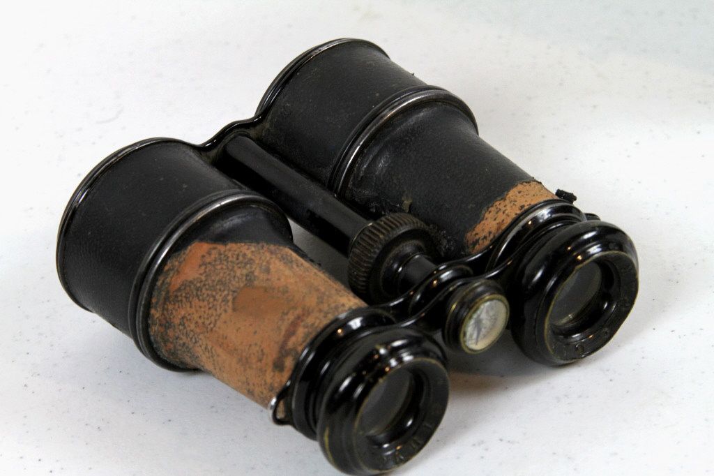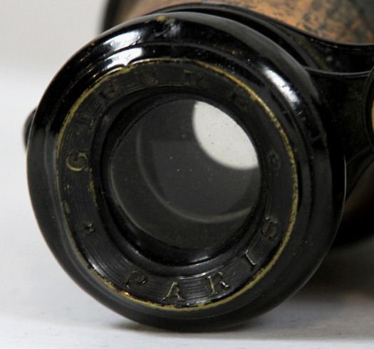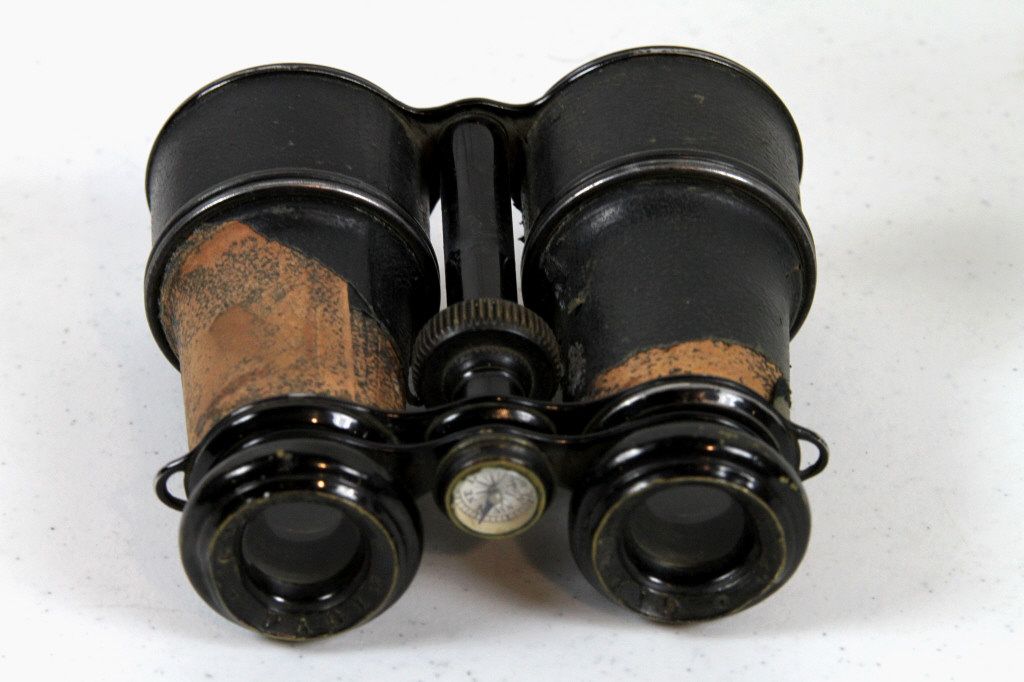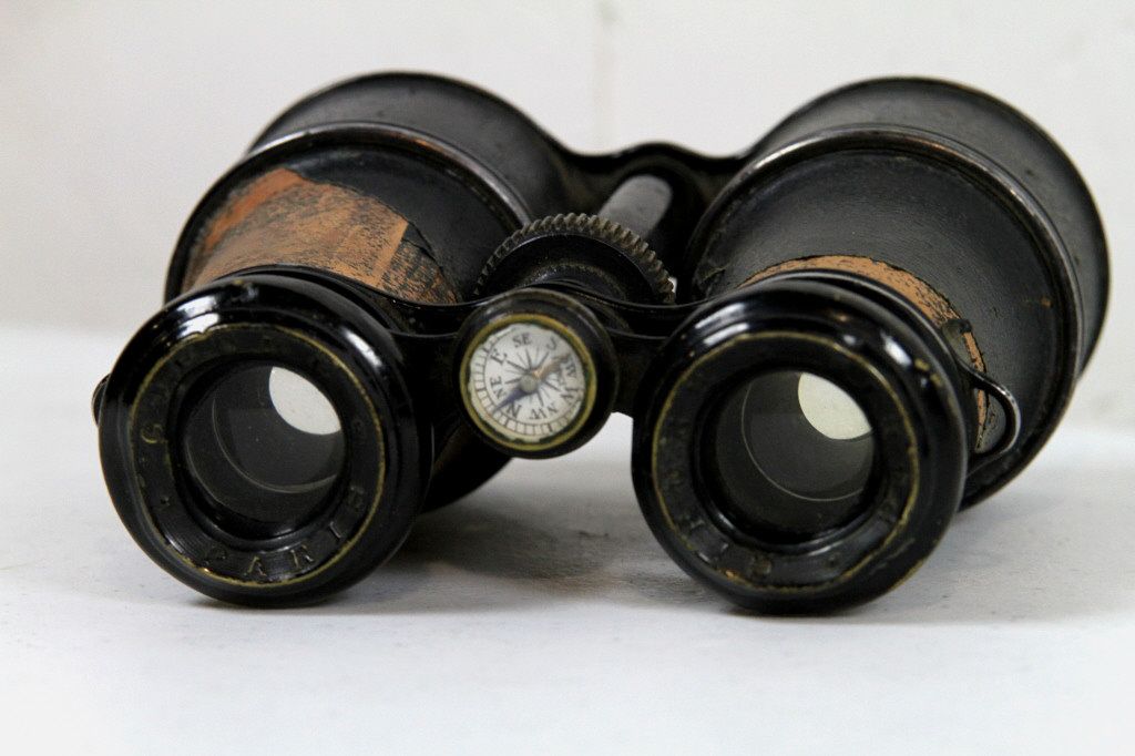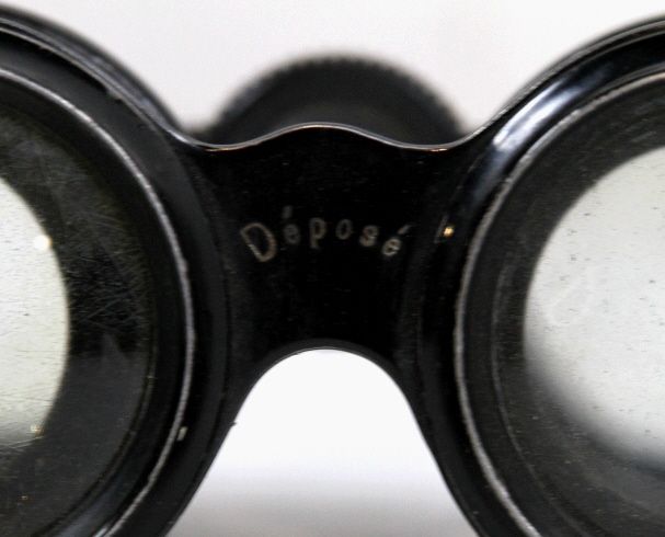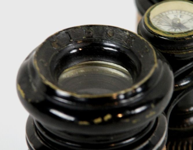 WWII French Binoculars Around the eye these read, "Gieure Paris" and on the front read, " Depose." They also have a built in compass and come with the original leather case.