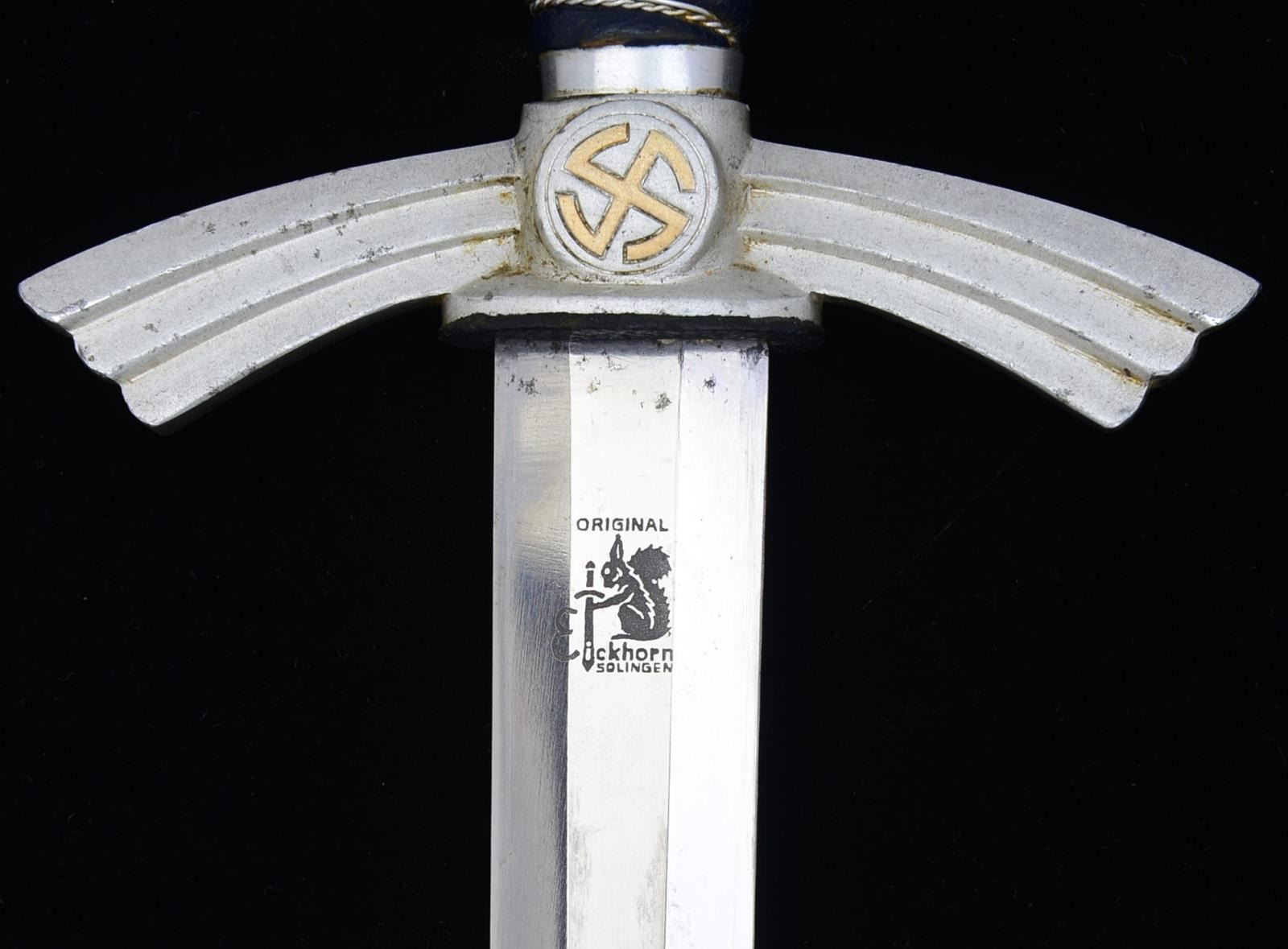 Overall length: 19 1/4". Blade marked, “ORIGINAL (squirrel) EICKHORN SOLINGEN”. Aluminum crossguard & pommel w/ gold plated Party symbols. Dual wire wrap on blue leather covered grip. Aluminum mounted scabbard w/ blue leather body. Original aluminum hanger. CONDITION: blade shows areas of original polish. Mounts & grip show light wear. Scabbard has a few scuffs & scrapes to the leather. (02-14618/BF). $500-750.