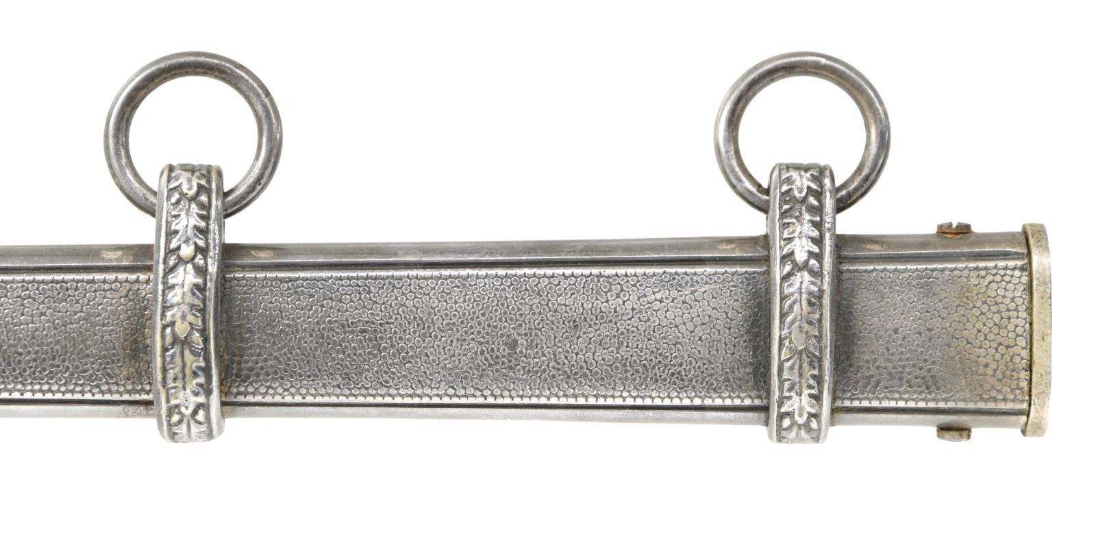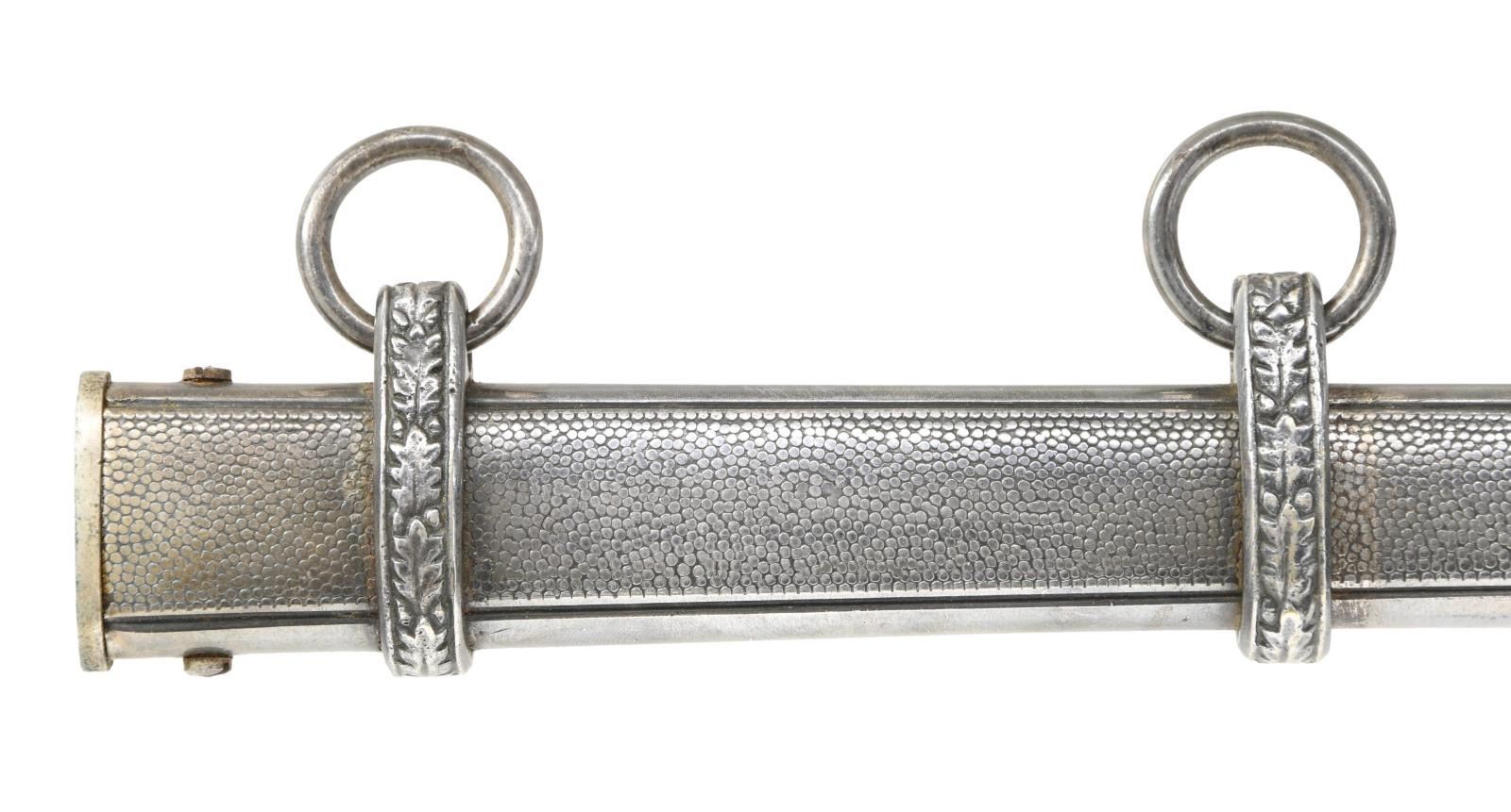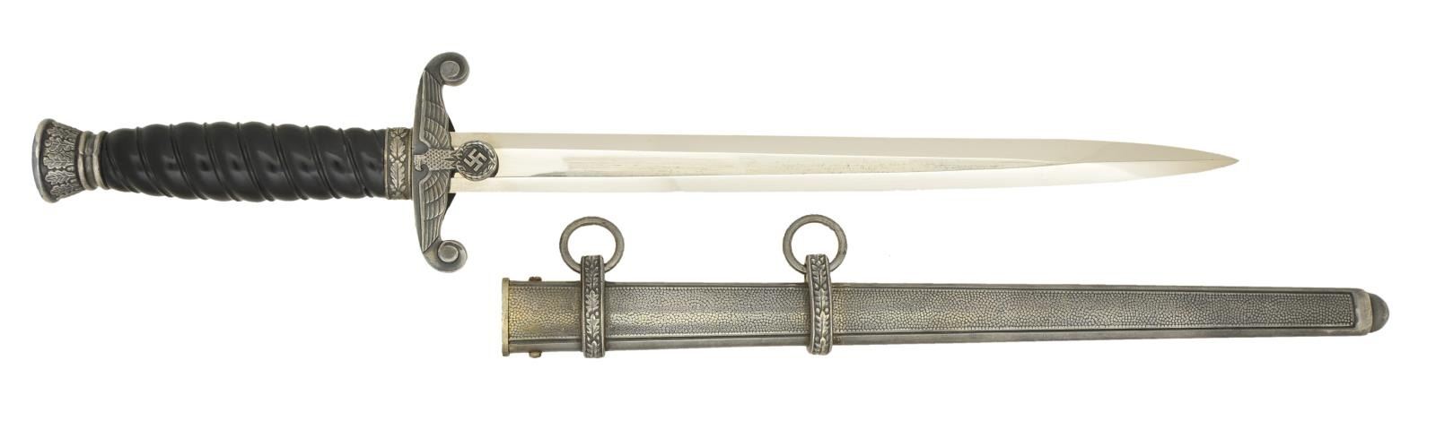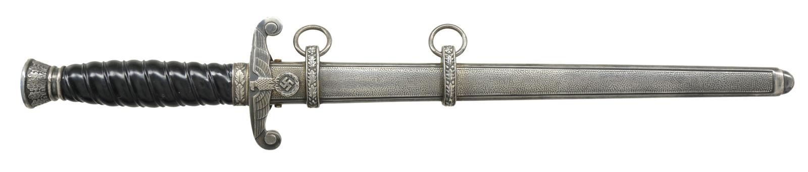 Overall length 15 5/8”. Plain blade marked on the reverse near the hilt “(logo) ROBT KLAAS SOLINGEN”. Silvered eagle cross guard with oak leaf embellished pommel & ferrule. Plated scabbard. It is questionable whether this cross guard is original to this dagger making us wonder about the originality of the piece. It also seems a bit heavy as compared to other 1st model Railway daggers. This dagger may be of post-WWII assemblage or production. CONDITION: blade shows minor scabbard wear. Hilt shows light overall wear, as does the scabbard. PROVENANCE: from the Lifelong Collection of Glen E. Mattox. (02-18194/BF). $500-800.