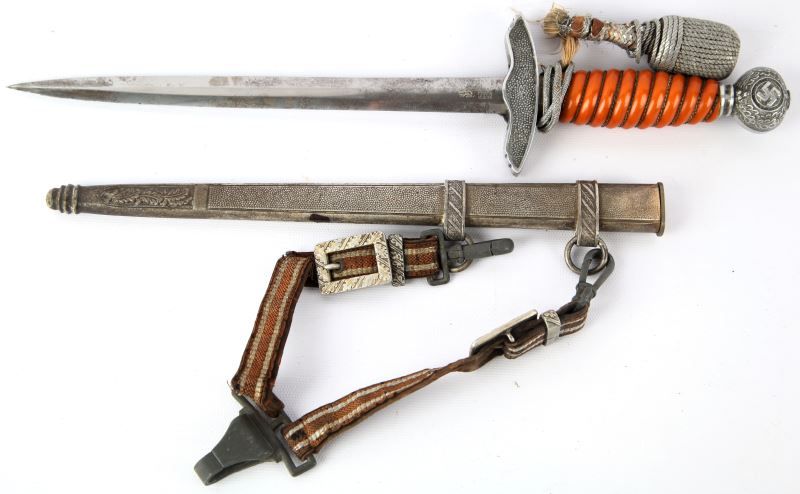 WWII German Second Model Luftwaffe dress dagger, maker marked Tiger, Solingen, complete with hanger and portepee. Light oxidization and scabbard wear to bladegrip and fittings very good. Scabbard is free of dents. Significant fraying to portepee, and age related damage and fraying to hanger, otherwise good condition. This lot has a reserve.