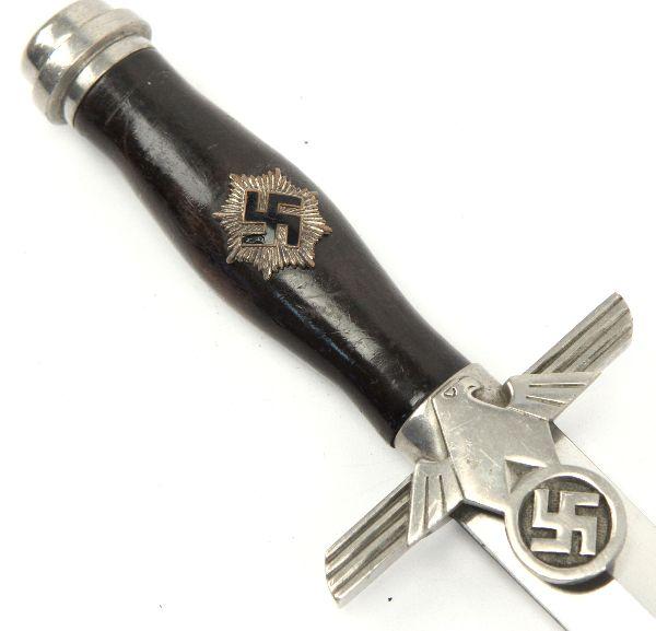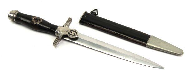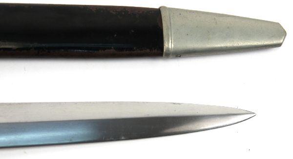 WWII German second pattern RLB Luftschutz dagger. E & F Horster makers mark on blade. 8.5 inch blade is in excellent condition. Wood grip and aluminum fittings in very good condition, with minor handling wear. Starburst emblem with swastika. Black enameled scabbard, with aluminum tip. Some losses to enamel on scabbard. Overall very good condition.