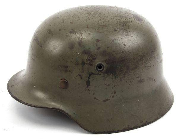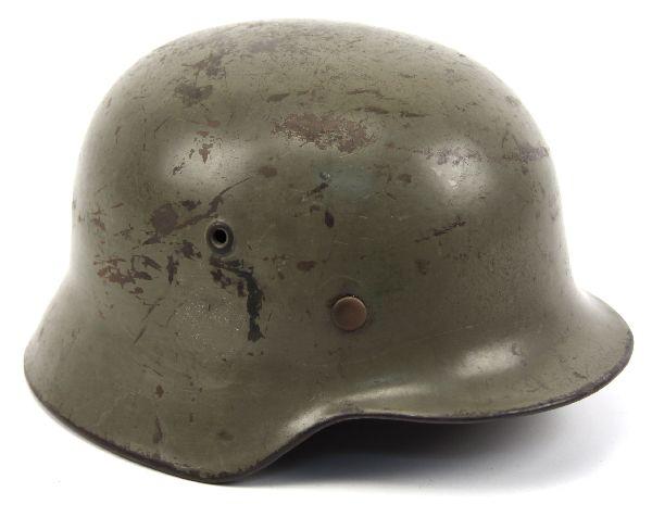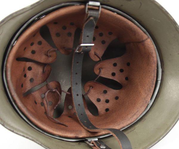 WWII German Afrika Korps M-40 helmet, with liner. Chinstrap is reproduction, marked "Berlin 1939", and liner is non German replacement. Helmet stamped "ET66 on inside rim near chin strap, and "607 / 58" on back middle inside rim. Finish appears unaltered, and is in good condition. Traces of decals can me seen on sides. Overall good condition.