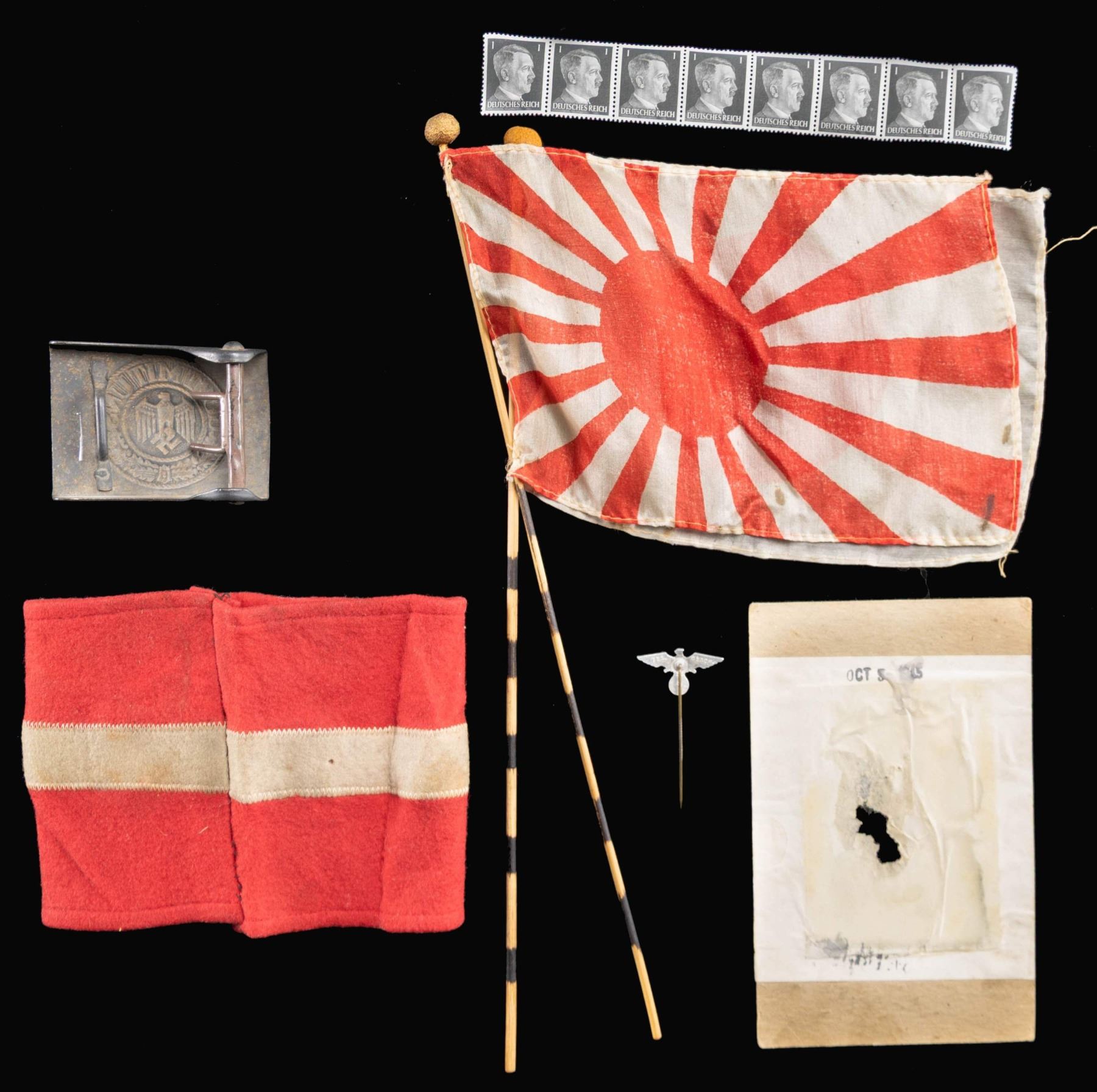 This varied lot includes 1 wool HJ armband of very small size. / 1 Veterans Association stick pin. / 1 Horizontal row of eight Hitler ein pfennig stamps. / 1 WWII German army belt buckle. / 1 Tin type photo of a post WWI US soldier. / 1 Small Japanese hinomaru flag on a bamboo stick. / 1 Small Japanese rising sun flag on a bamboo stick. CONDITION: most items show light wear. Photo emulsion is bubbling. (02-25083/BF). NON-GUN. $150-250.
