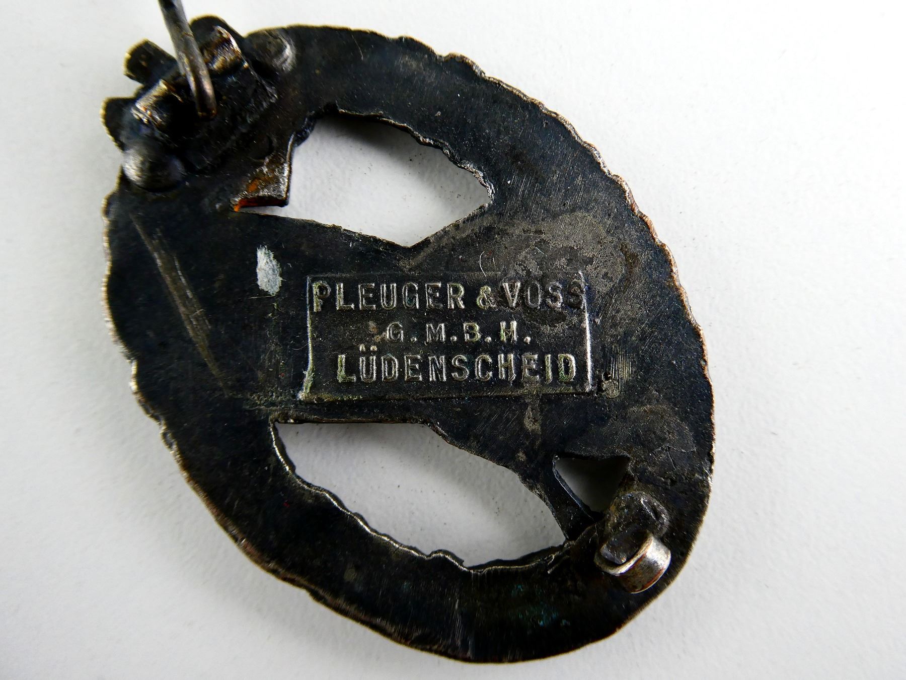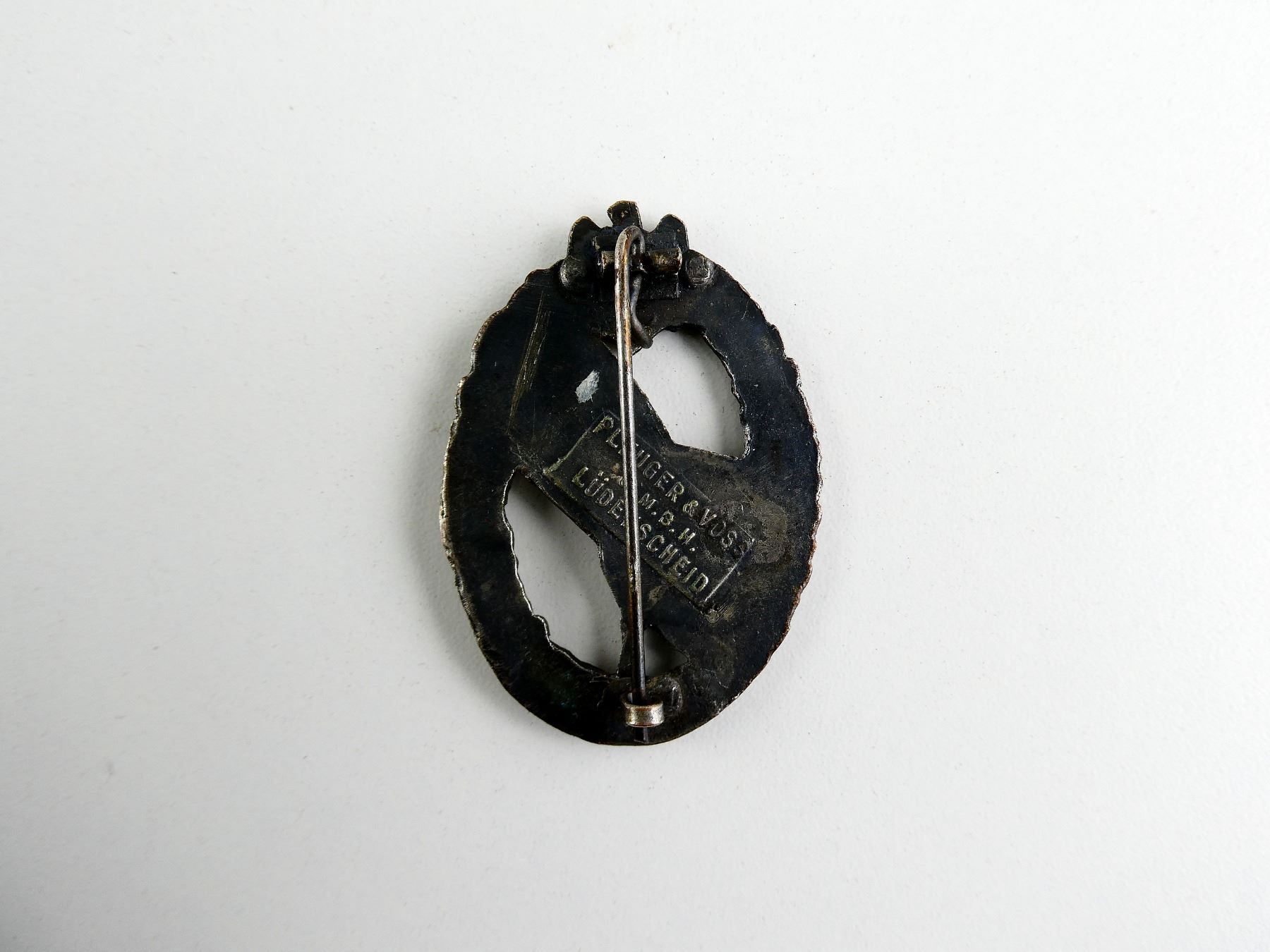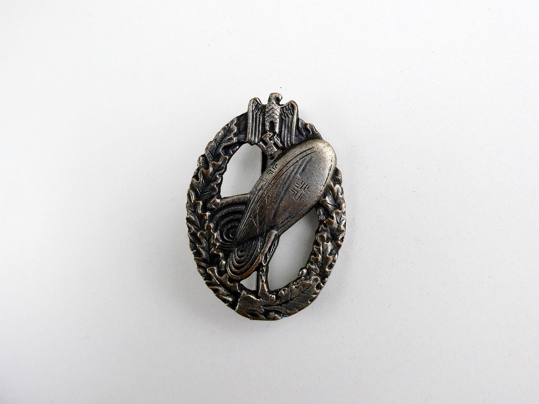 (1) FOR OBSERVERS IN TETHERED BALLOONS WHO HAD PROVEN THEMSELVES AT THE FRONT IN RECOGNITION OF THEIR SERVICE, BADGE NON-MAGNETIC, PIN IS MAGNETIC, ROUND PIN WITH FLAT CATCH, BACK MARKED: "PLEUGER & VOSS, G.M.B.H., LUDENSCHEID", APPROX. 41MM WIDE, APPROX. 58MM HIGH. SEE PHOTOS.