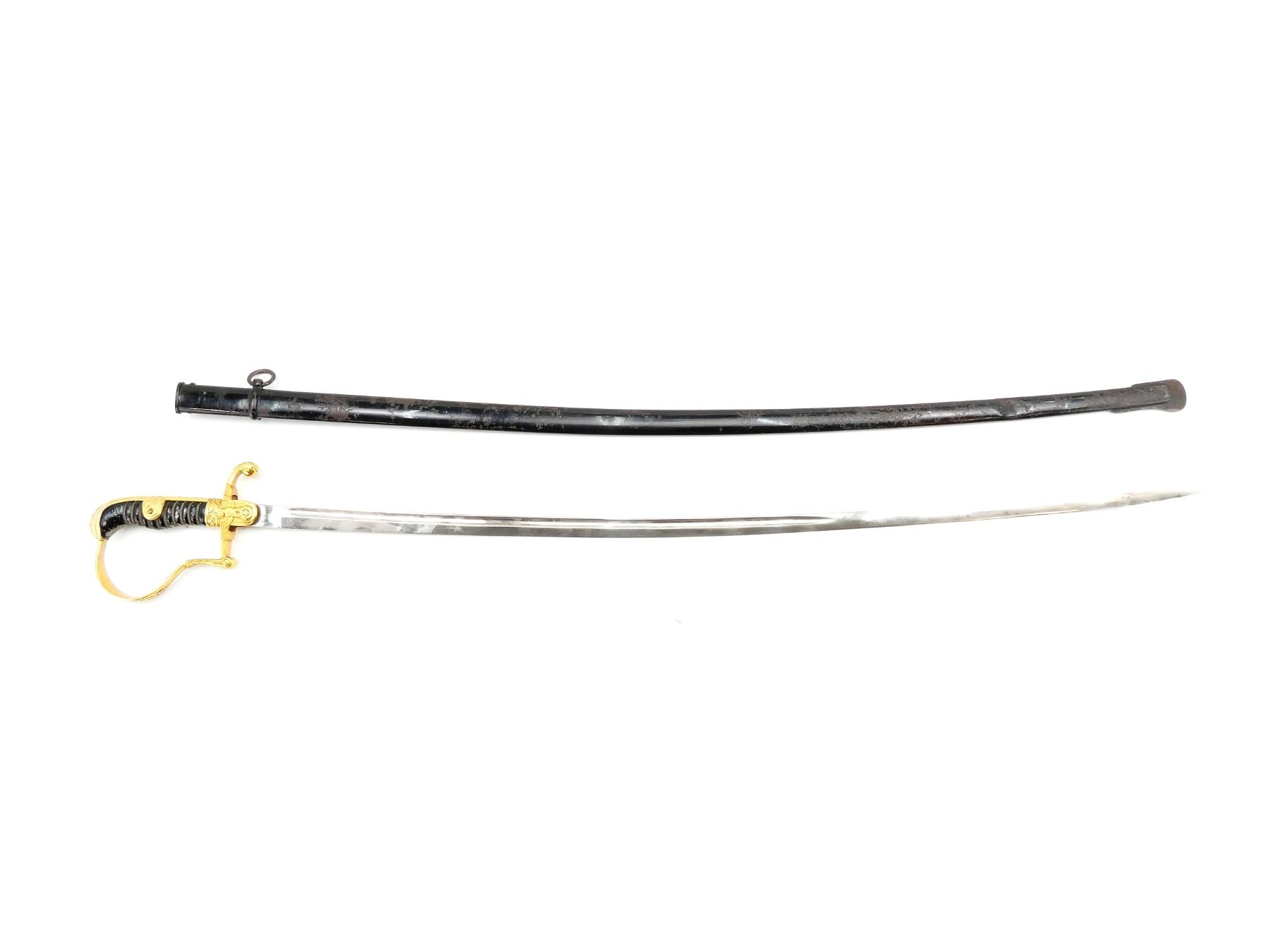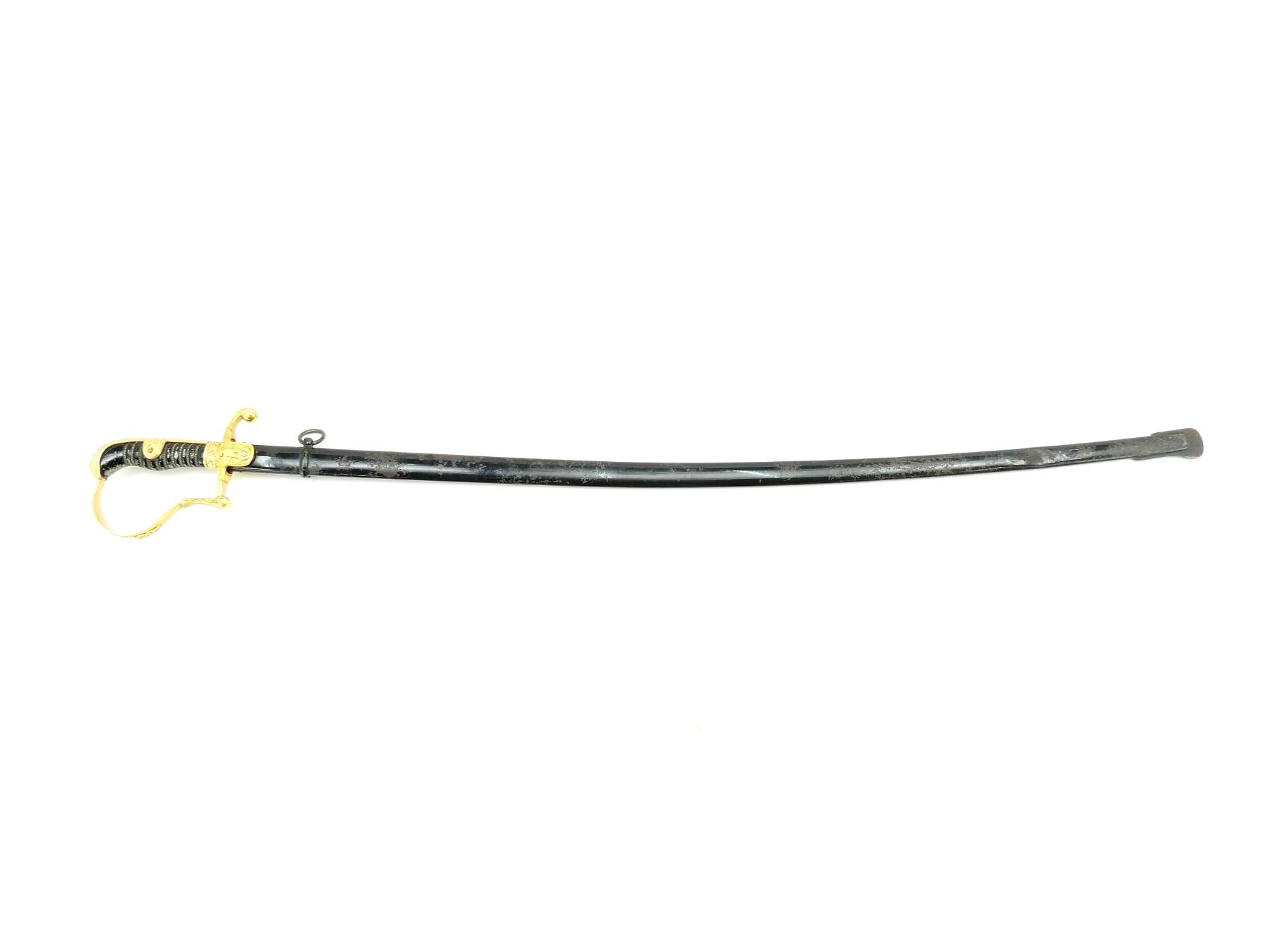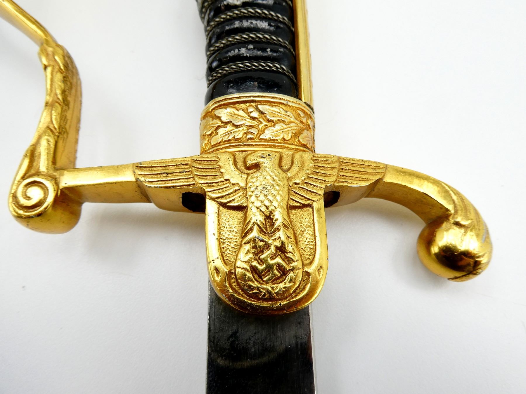 (1) SLIGHTLY CURVED SINGLE-FULLERED BLADE, RICASSO MARKED: "C", "J" OVER SHIELD WITH A "Z" (CLEMEN & JUNG, SOLINGEN), LEATHER WASHER / BUFFER PAD, BRASS CROSS-GUARD WITH FLYING EAGLE HOLDING SWASTIKA, OAK LEAF & ACORN PATTERN JUST ABOVE CROSS-GUARD, BLACK TRIPLE WIRE WRAPPED GRIP, ALL WIRE IS TWISTED, D-SHAPED HILT WITH OAK LEAF DESIGN, BRASS DOVE HEAD SHAPED POMMEL WITH OAK LEAF & ACORN DESIGN & ALONG BRASS ON BACKSIDE OF GRIP, NO VISIBLE MARKINGS, BLACK PAINTED METAL SCABBARD, SQUARE LOOP STUD, ONE HANGER, THROAT MARKED: "542", MISSING ONE THROAT SCREW, BLADE APPROX. 33 7/8" & OAL APPROX. 38.5". SEE PHOTOS.
