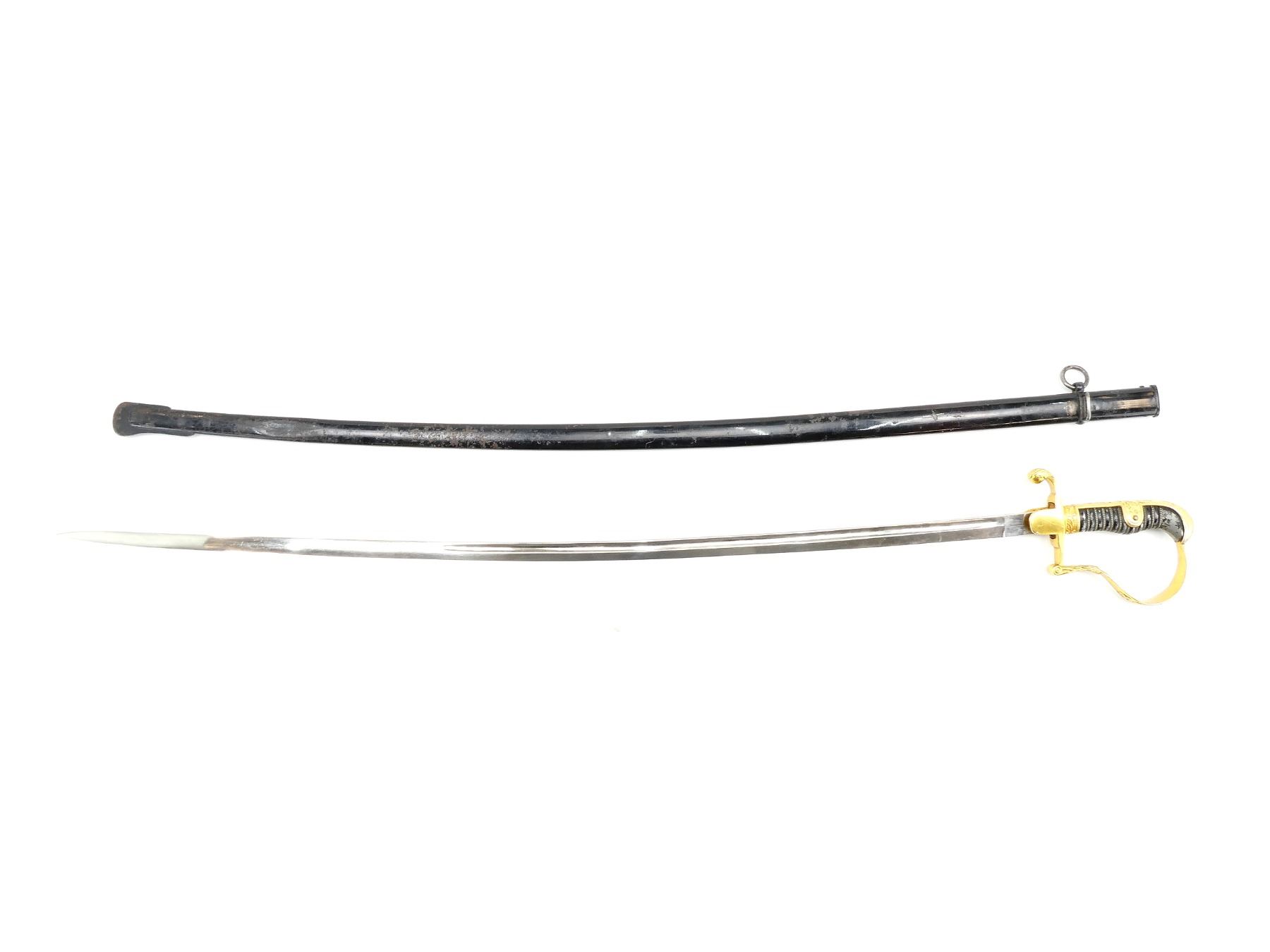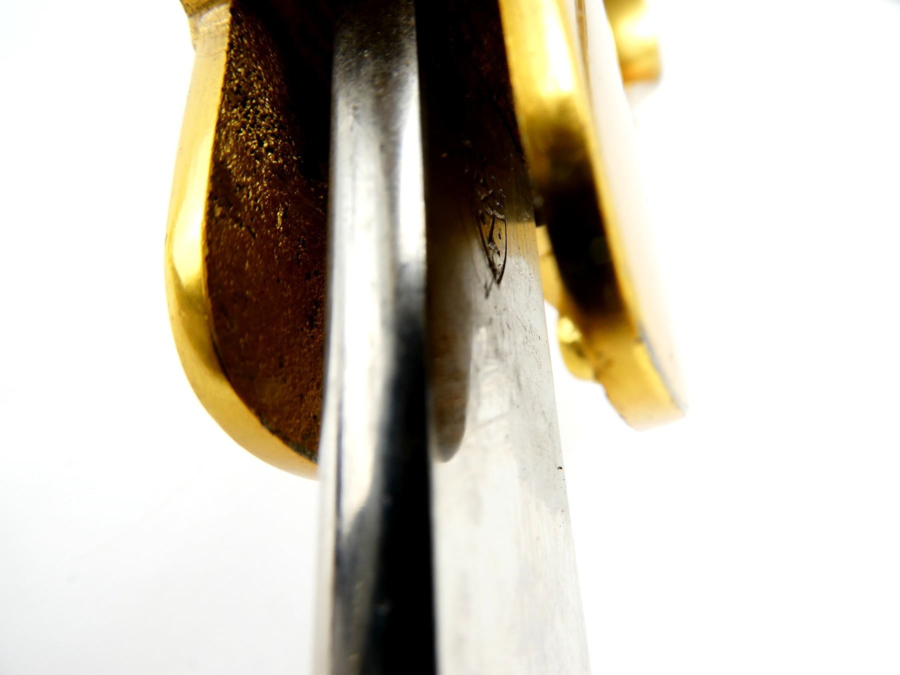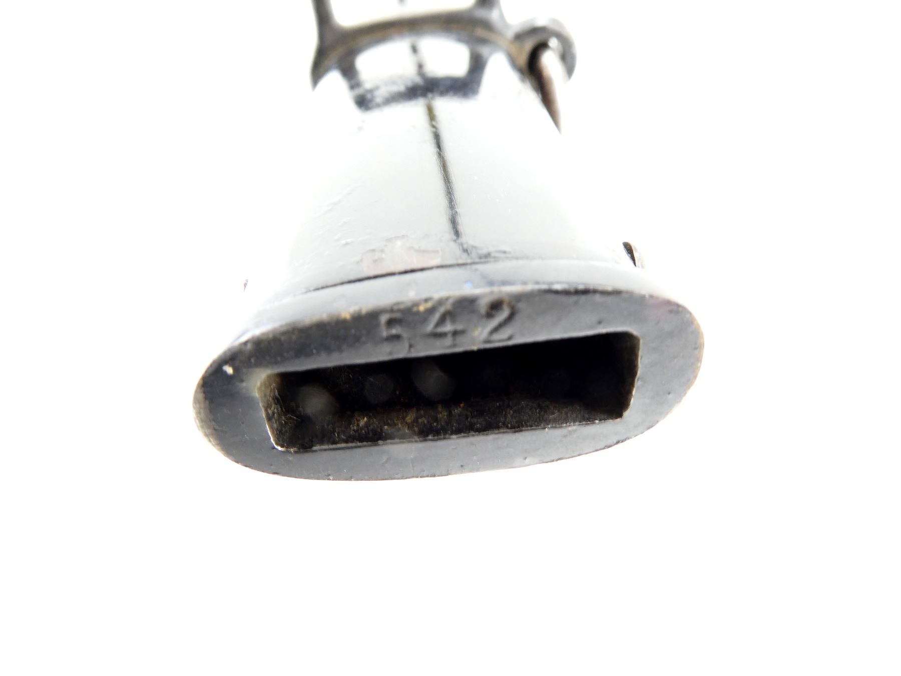 (1) SLIGHTLY CURVED SINGLE-FULLERED BLADE, RICASSO MARKED: "C", "J" OVER SHIELD WITH A "Z" (CLEMEN & JUNG, SOLINGEN), LEATHER WASHER / BUFFER PAD, BRASS CROSS-GUARD WITH FLYING EAGLE HOLDING SWASTIKA, OAK LEAF & ACORN PATTERN JUST ABOVE CROSS-GUARD, BLACK TRIPLE WIRE WRAPPED GRIP, ALL WIRE IS TWISTED, D-SHAPED HILT WITH OAK LEAF DESIGN, BRASS DOVE HEAD SHAPED POMMEL WITH OAK LEAF & ACORN DESIGN & ALONG BRASS ON BACKSIDE OF GRIP, NO VISIBLE MARKINGS, BLACK PAINTED METAL SCABBARD, SQUARE LOOP STUD, ONE HANGER, THROAT MARKED: "542", MISSING ONE THROAT SCREW, BLADE APPROX. 33 7/8" & OAL APPROX. 38.5". SEE PHOTOS.