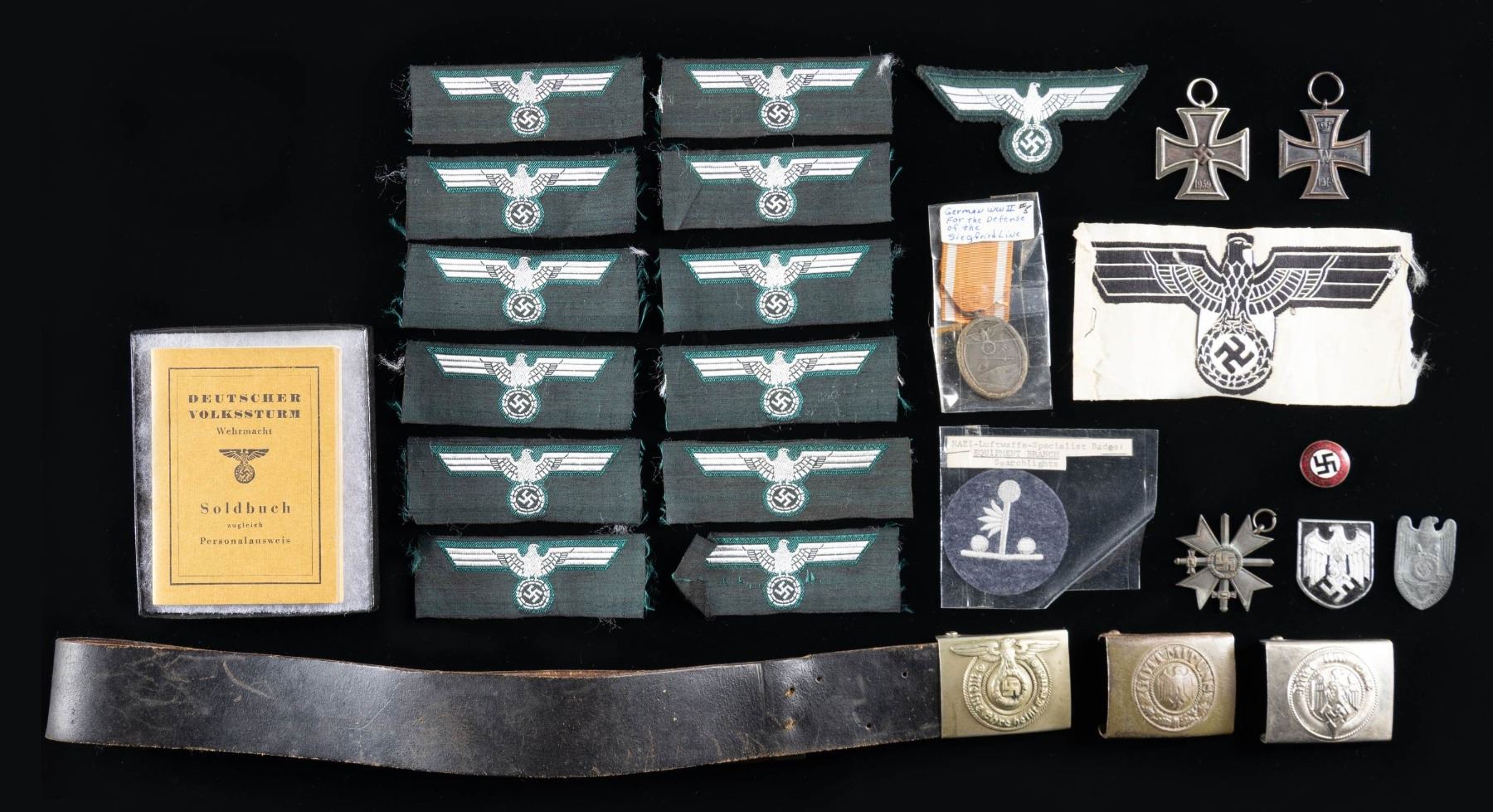 This varied lot of WWII German items include 1 SS belt and marked buckle. / 1 Army buckle. / 1 HJ buckle. / 1 War Merit Cross with swords no ribbon. / 1 WWI 2nd Class Iron Cross without ribbon. / 1 Westwall Medal with ribbon. / 1 WWII 2nd Class Iron Cross without ribbon. / 12 Unissued Army Panzer enlisted breast eagles. / 1 Luftwaffe searchlight specialty patch. / 1 Army sportshirt eagle . / 1 Army pith helmet eagle shield. / 1 1942 tinnie. / 1 Party pin. / 1 Army Panzer flat bullion breast eagle. / 1 Deutscher Volksturm Soldbuch. CONDITION: all items show light to moderate wear. Belt has a few extra holes. (02-24137/BF). NON-GUN. $500-800.