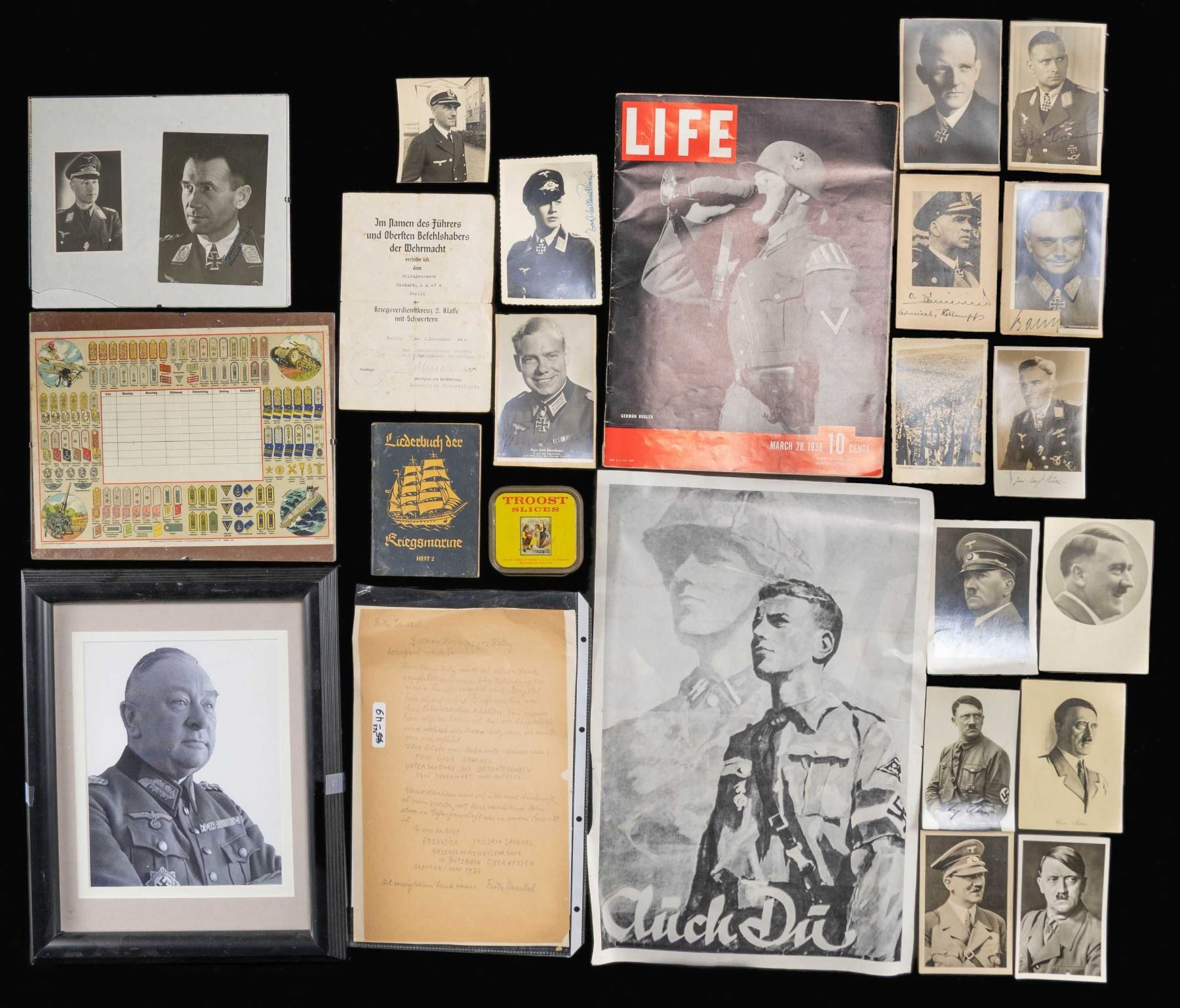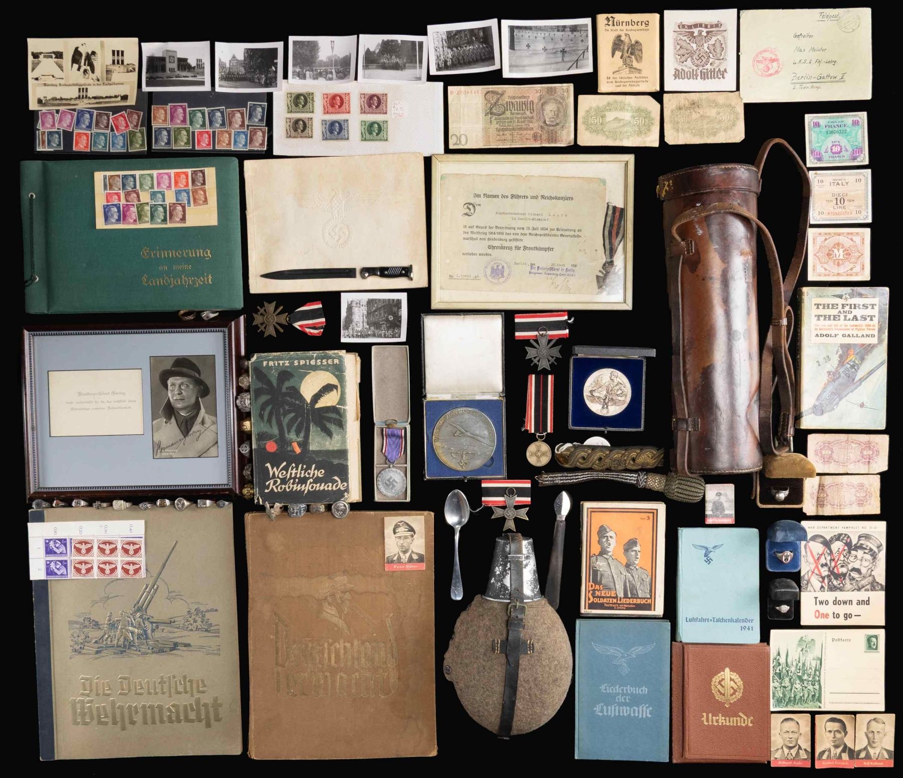 This varied lot includes 1 Luftwaffe teaspoon. / 1 WWI Prussian officer's shoulder strap. / 1 Broken miniature Mauser K-98 bayonet without scabbard. / 1 Silvered desk medal measuring 2 3/8" in presentation box. / 1 NSFK 3 1/4" desk medal in original case. / 1 Book titled "THE FIRST AND THE LAST" autographed by Adolf Galland. / 30 WWII German finger rings of all manner of design. Most, but not all, appear to be of WWII era manufacture. / 1 March 28, 1938 copy of Life magazine. / 1 German rank insignia identification guide. / 1 War Merit Cross with Swords and award certificate. / 1 WWI 1914-18 Cross with swords and award document. / 90 Approximately WWII German stamps. / 1 War Merit medal with issue envelope. / 2 War Merit crosses with issue envelopes. / 1 Luftschutz Service medal with ribbon in original box. / 1 Bread bag strap. / 1 Partial sword knot. / 1 Group of about 100 photos, stamps, post cards, banknotes, envelopes, booklets and more. / 2 Photos of Luftwaffe officers. / 1 Large format photo of a German General. / 1 Hitler Youth poster. / 1 Signed Goring photo not examined out of frame. / 1 Stationary and envelope from Oberst Hantz Mueller. / 1 Signed letter from Fritz Sauckel from Nuremberg in 1946. / 1 SA identification book. / 3 Songbooks from the Army, Navy, and Luftwaffe. / 1 Pre-WWII HJ photo album. / 1 Luftwaffe pocket calendar. / 1 Canteen with cover and cup. / 1 Leather map case. / 1 Booh titled "Westliche Robinsouade" signed and inscribed by Himmler. / 1 Tipped-in photo album titled "Die Deutsche Wehrmacht". / 1 Tippen-in photo album titled "Deutschland erwacht". / 1 Small book about the Anschluss and Sudetenland. CONDITION: as one might expect in a group this size condition does vary, but most items show light overall wear as would be expected. (02-25023-6/BF). $1500-3000.