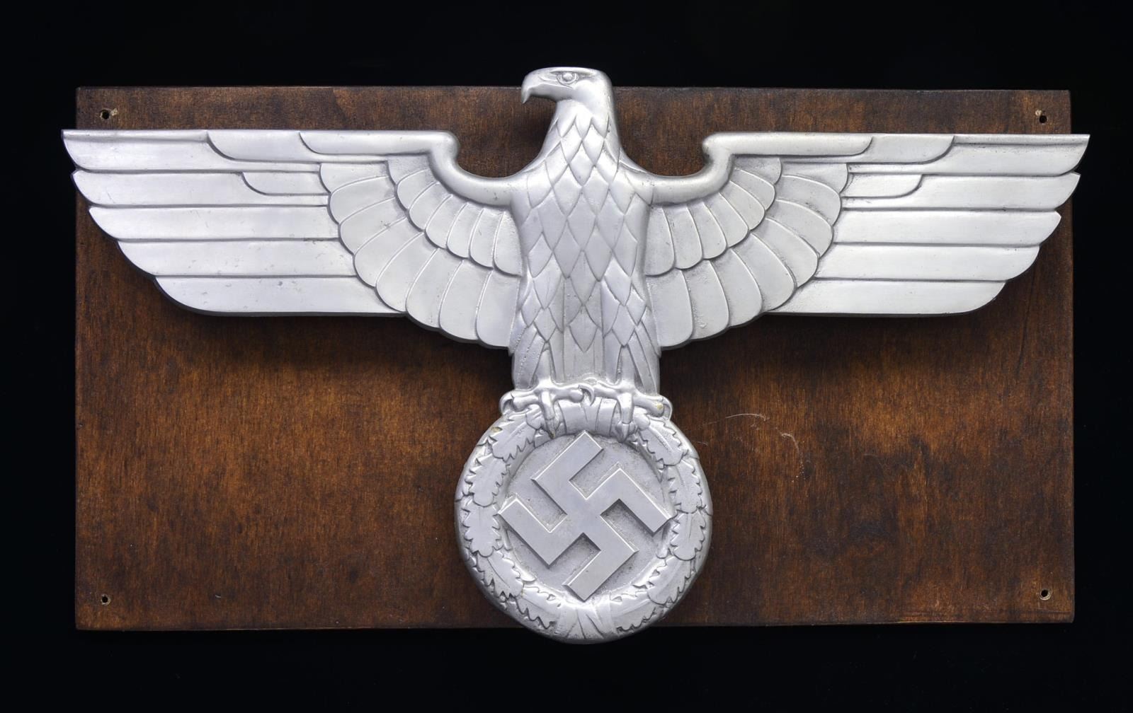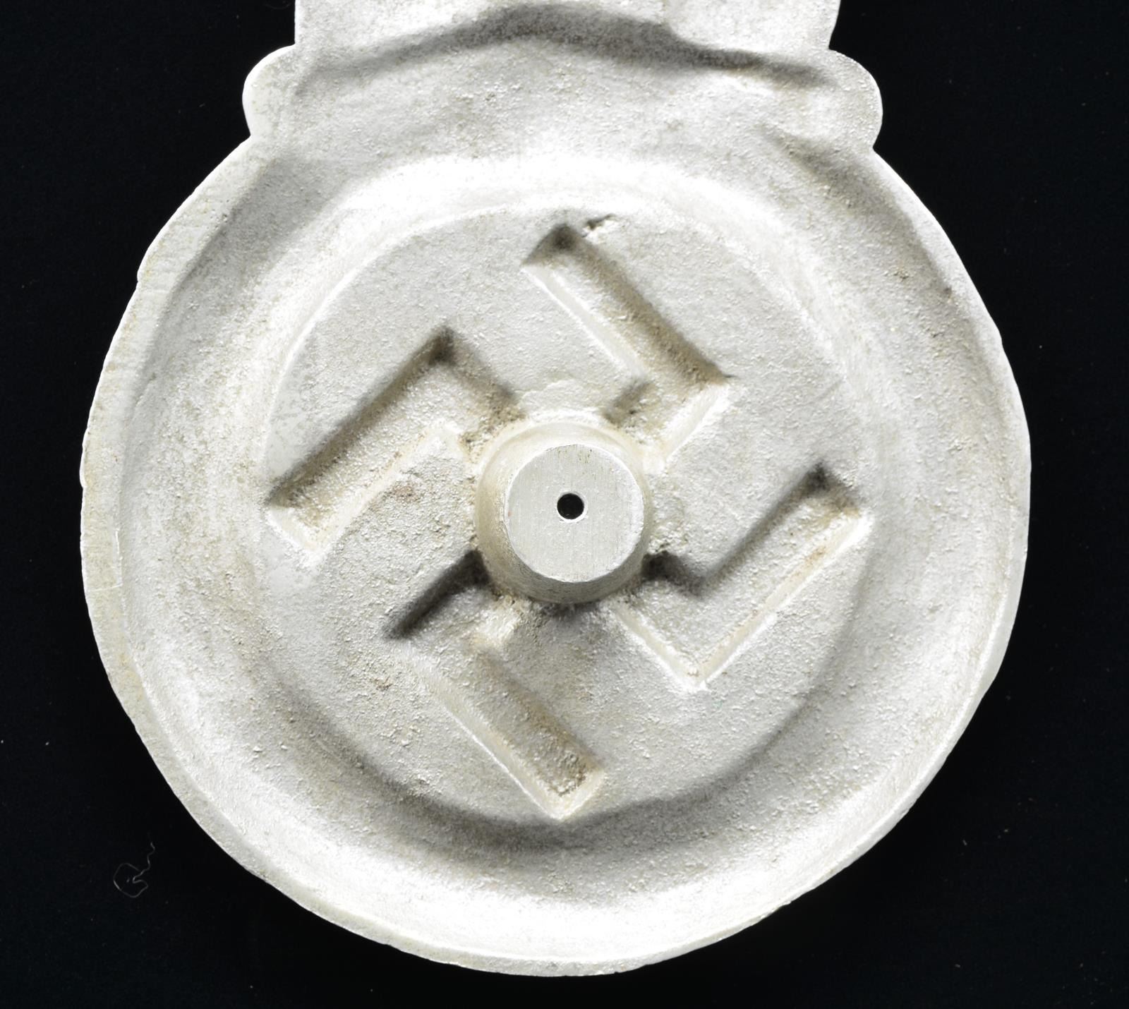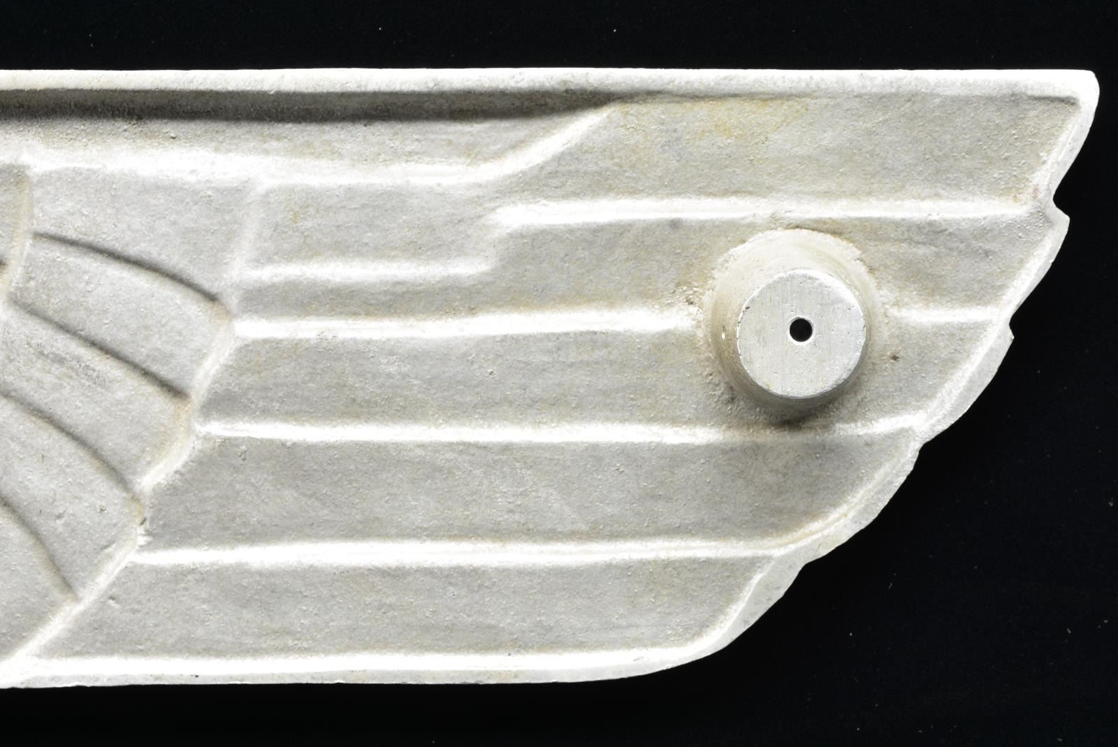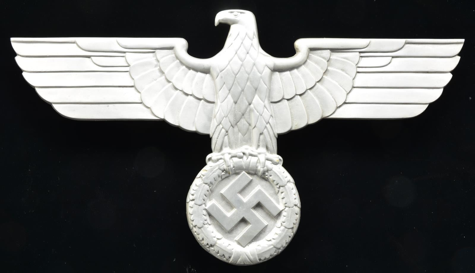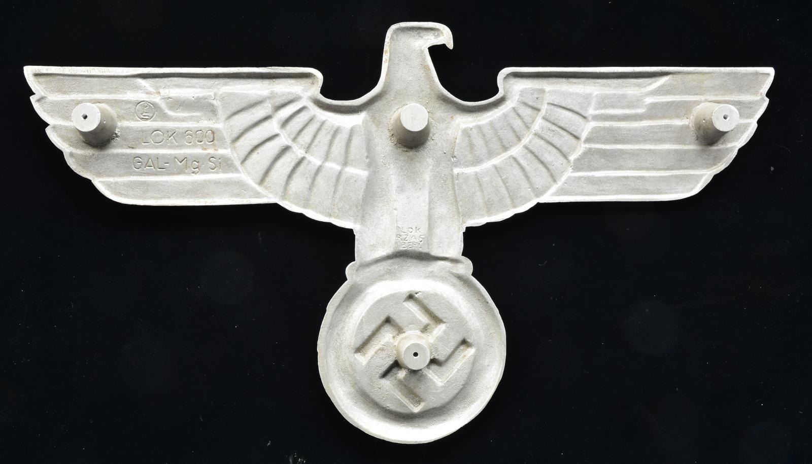 This aluminum eagle has a wingspan of 23 3/4" & a height of 13 1/2”. They were affixed to the sides of official Reichsbahn boxcars. Eagle stands on a wreath surrounding a Party symbol. The reverse is marked, “(company logo) LOK 600 GAL-Mg Si” & “LOK RZA5 BERL”. CONDITION: eagle shows light wear overall. (02-14539/BF). $1,000-1,500.