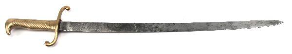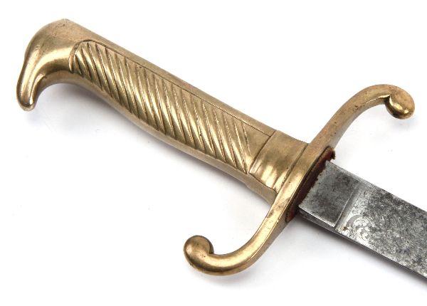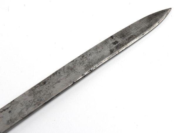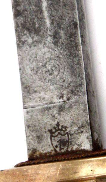 23.5 inch sword with engraved 19 inch curved blade from Clemen & Jung. Very good condition with discoloration from age and nicks in blade from use.