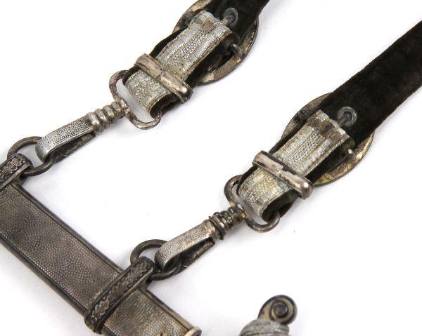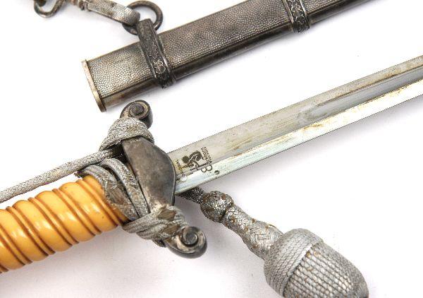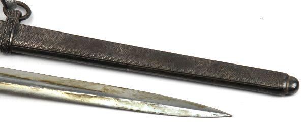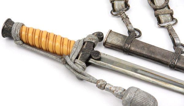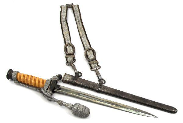 Carl Eickhorn dagger complete with hanger and portepee. 10.25 inch tapered blade marked "Original Eickhorn Solingen". Quillon depicts outstretched eagle griping swastika. Orange celluloid grip with laurel relief pommel. Hanger and portepee show some wear, but overall very good condition.