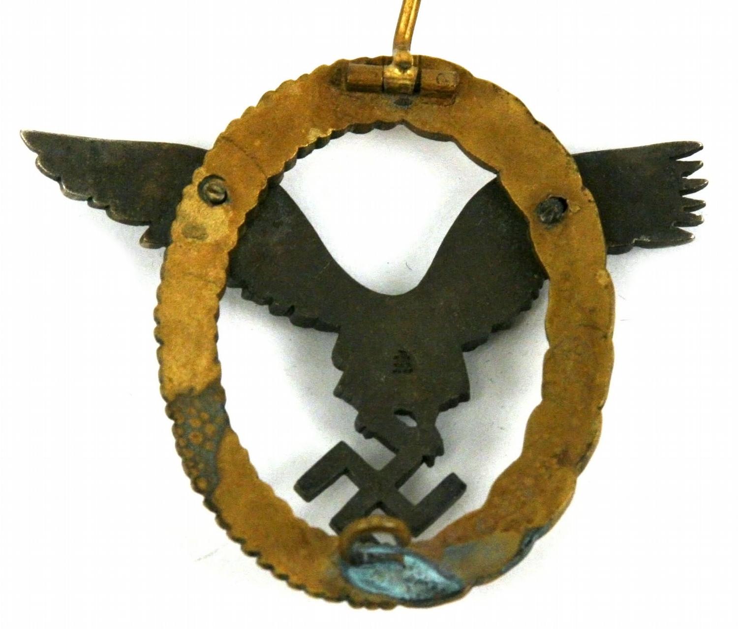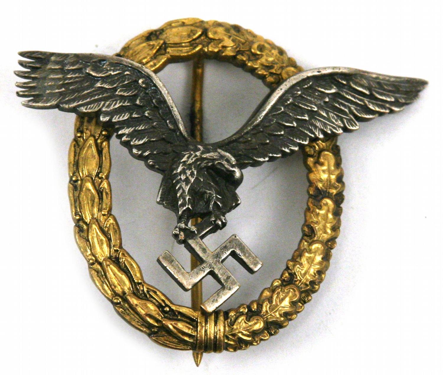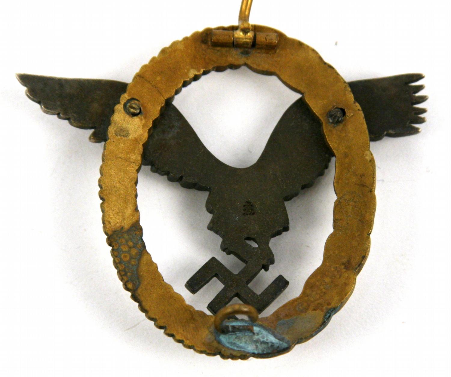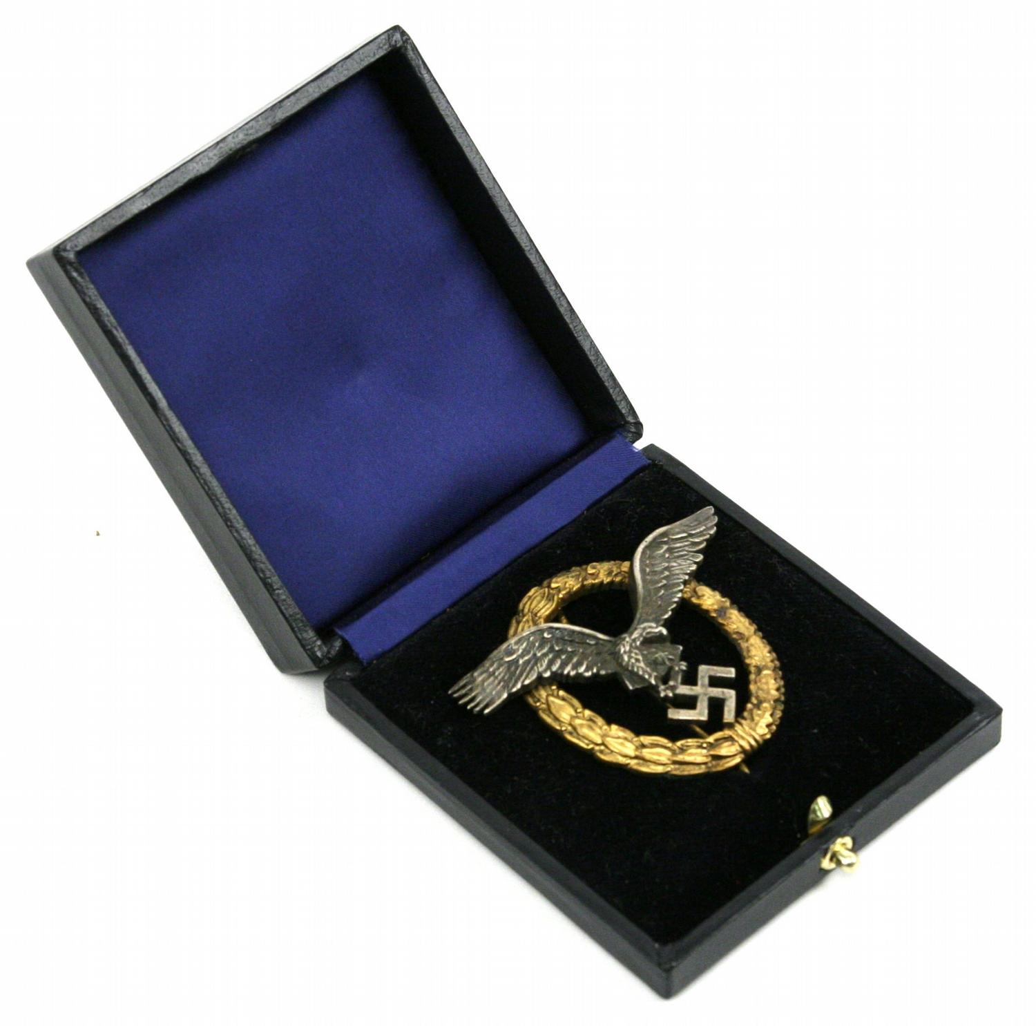 WWII Third Reich Luftwaffe pilot observer badge, in case. Marked "Luftwaffe / Flugzeugfuhrer- u. Beobachter Ubeziechen" on front of box. Very small makers mark on back. Overall very good condition. 30 grams.