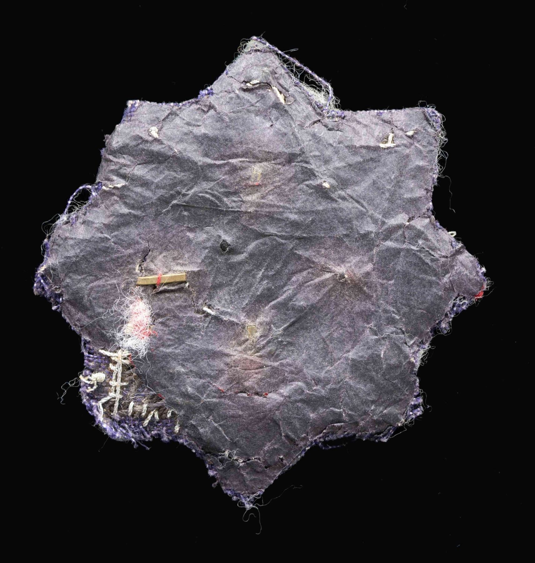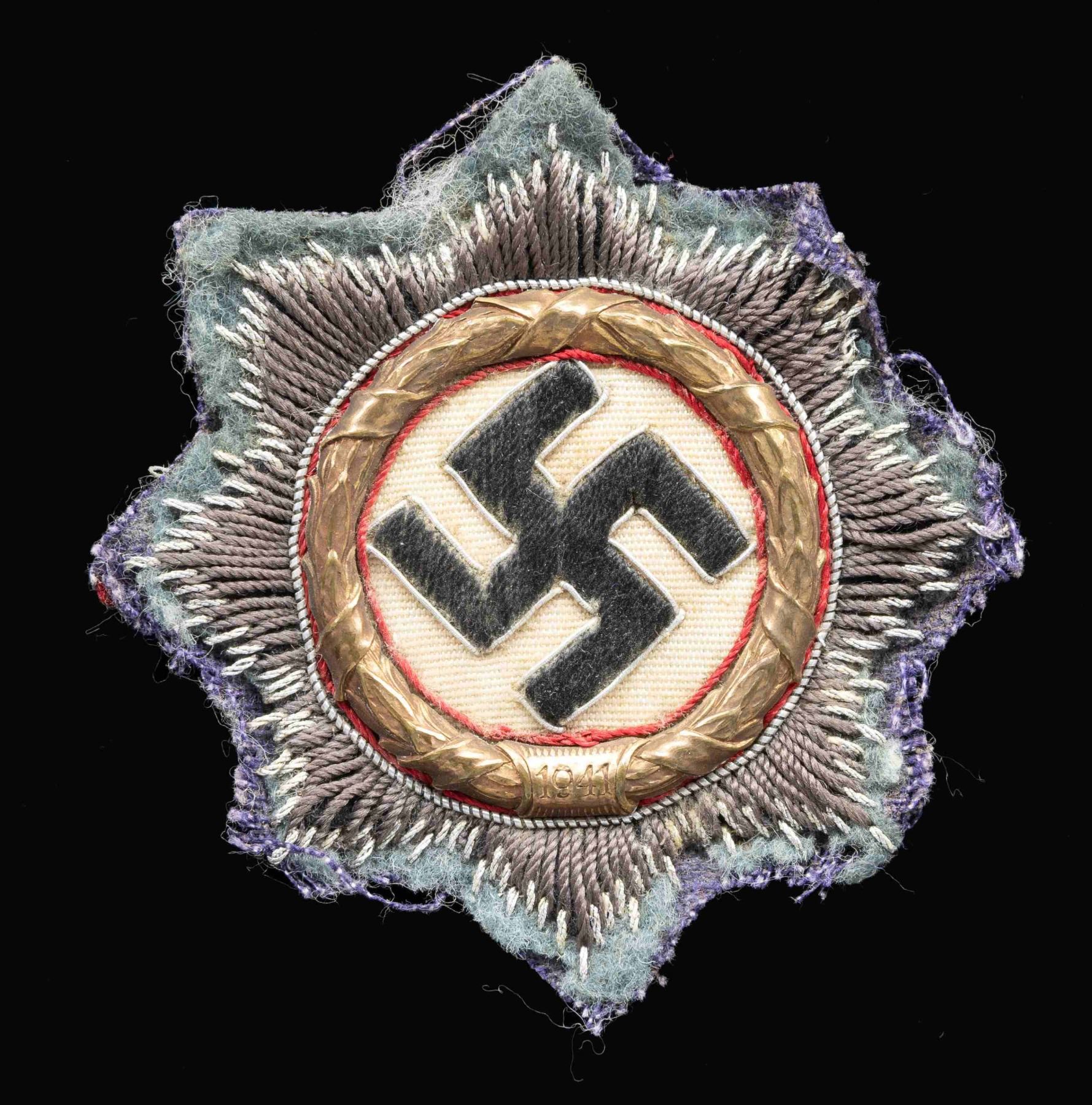 A nice original WWII cloth German Cross in gold featuring a bullion and thread starburst design with a red bordered metallic gold wreath around a white center and silver bullion bordered black cloth Party symbol. The reverse has the expected paper backing. CONDITION: badge shows light to moderate wear with some moth nips to the outlying material. (02-24878-7/BF). $500-800.