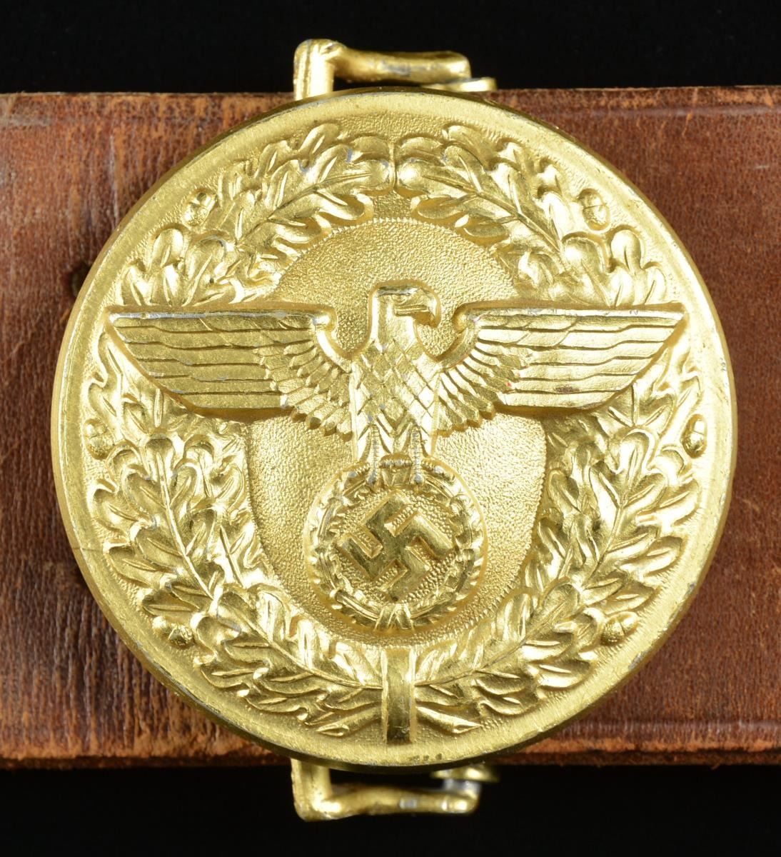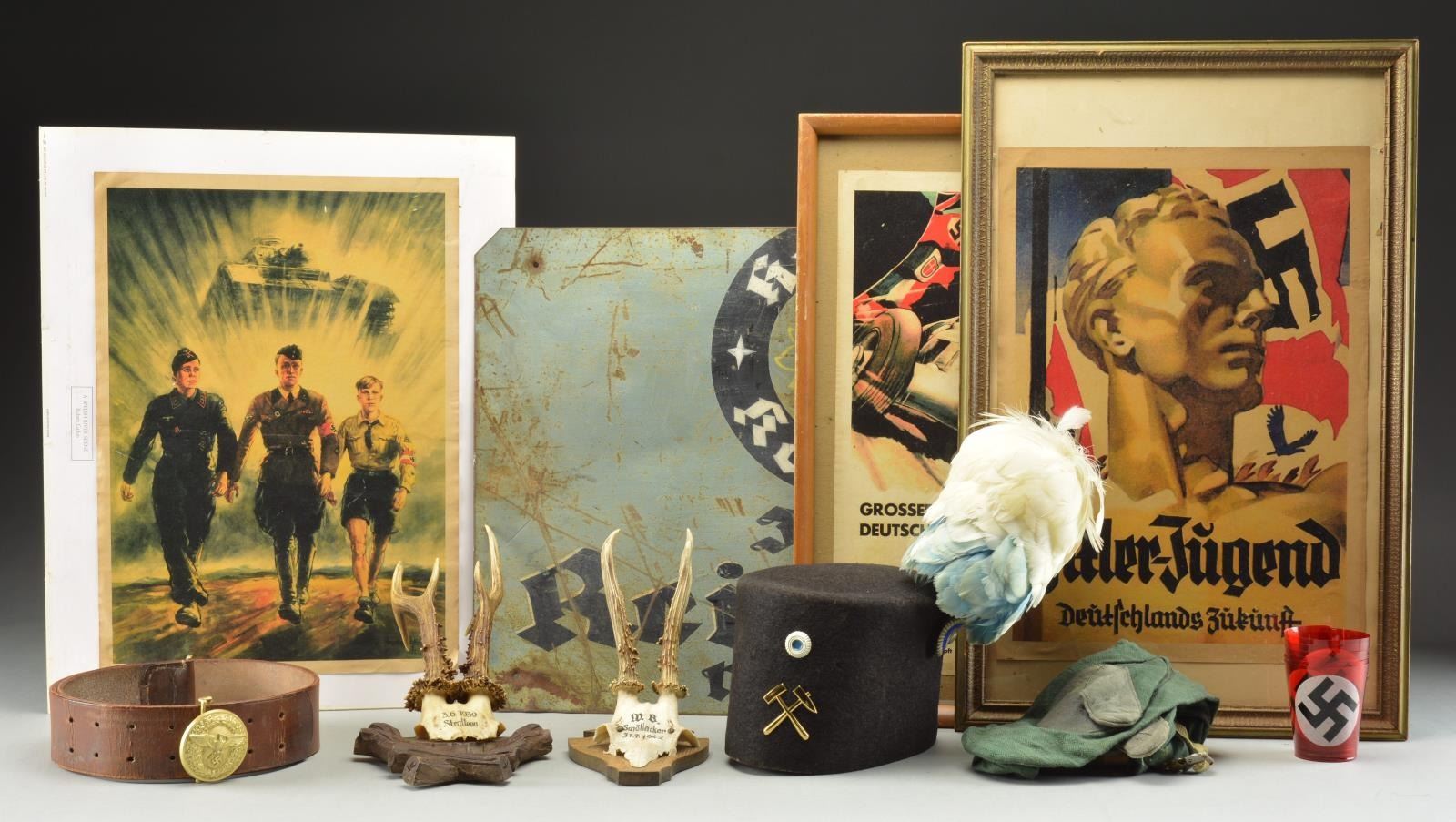 LEADER'S BELT & BUCKLE, WEHRMACHT MITTENS, POSTERS & MORE. This very interesting group includes a large iron sign measuring 17" x 27 1/4" painted with black, green, white, yellow and red paint. The sign is from a coal mine in Germany either during or before the war. The script is difficult to read but it appears to say, "KOLZU. (crossed hammer mining insignia) KOHLEN JODER REITINGER MAXGLAN". There is a nail hole in each corner for attachment. / 1 WWII or prior Bavarian miner's shako featuring a black pressed wool body with gilded brass crossed hammers on the front. The front of the cap also has a silver kokard with light blue center. The side of the cap has a silver and blue cockade with a white & blue feathered plume attached. / 1 set of deer antlers mounted to a wooden plaque inscribed on the front, "W.B. Schollacker 31.7.1942". / 1 set of deer antlers mounted to a wooden plaque inscribed on the front, "3.6.1939 Strallegg". / 1 Very fine NSDAP Political Leader's 2 piece gold colored buckle and brown leather belt. / 1 Pair of Wehrmacht mittens made of green cotton with leather reinforced palms and thumbs. Wrist straps are complete and functional. / 5 NSDAP Party Christmas candle cups of red cellophane with painted Party symbol on a round white field. / 1 Framed poster measuring approx. 23" x 15 1/2" of a young German looking right with Hitler Youth flags in the background. The base of the poster reads, "Hitler-Jugend Deutschlands Zukunft". / 1 Small poster measuring 17 1/4" x 12 1/4" featuring a Hitler Youth member, an NSKK member and a Panzer member marching forward with a tank in the background. Poster has been glued to a backing board. / 1 Framed poster measuring approx. 18" x 13" featuring a speeding race car with international flags in the background with the German flag featuring a Party symbol in the center. The poster reads, in part, "Hans Stuck Deutscher Strassenmeister fur Rennwagen 1938 uberlegener SIEGER AUF AUTO UNION". CONDITION: sign shows wear and oxidation but details remain quite clear. Belt, hat, antlers and mittens show very light wear. Posters are a bit discolored. (02-17507/BF). $1,000-1,400.