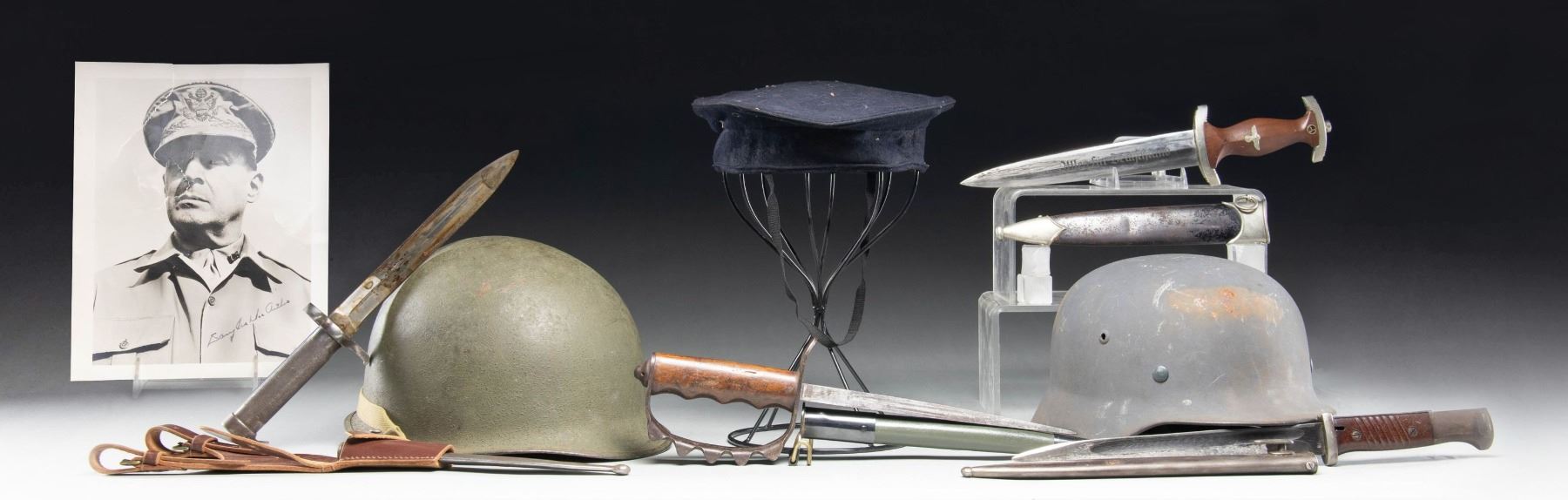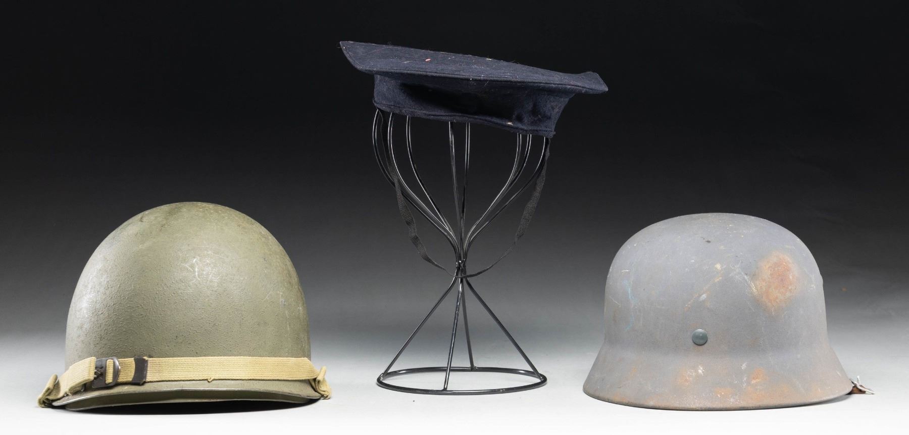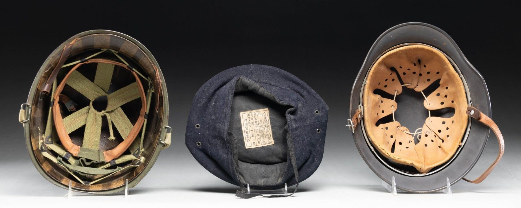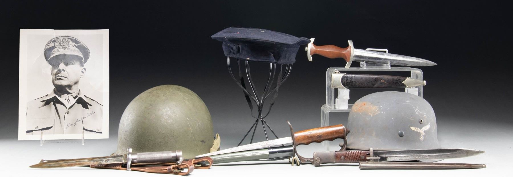 This lot includes 1 M1935 Luftwaffe single decal helmet with a sand gray finish. The interior rear is stamped "015" and the interior left is stamped "Q68". Liner and chinstrap appear unissued. / 1 US M1 helmet with a rear seam and swivel bails. The liner is of WWII vintage. / 1 WWII Japanese Navy enlisted man's "Donald Duck" hat with an interior label featuring many Japanese characters. 1 US M1917 trench knife by A.C. Co. with a correct style scabbard. This fine original knife is marked on the inside of the knuckle bow "A.C.CO. U.S.A. 1917". the scabbard appears to be a modern replacement. / 1 Mauser K-98 bayonet & scabbard with matching numbers. Blade has been sharpened. / WWII German NSKK dagger measuring 14 3/4" overall with a blade that is etched "Alles fur Deutchland" and a marking that reads "CARL SCHMIDT SOHN A.-G. (logo) SOLINGEN". Nickel silver crossguard stamped "S" on the reverse and a matching pommel guard. Black anodized scabbard with plated mounts. Scabbard has a noteable dent and some finish loss. / 1 Swedish M1896 with scabbard and frog. 1 Damaged photo of a US General. CONDITION: most items show light wear except as noted above. (02-24446/BF). NON-GUN. $1,200-1,600.