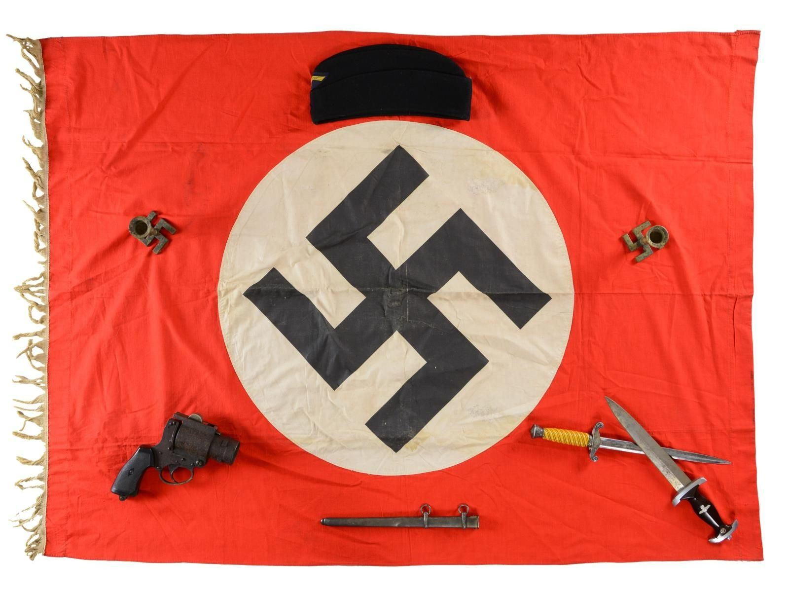 WWII GERMAN DAGGERS, HAT, FLAG, CANDLESTICKS, & A