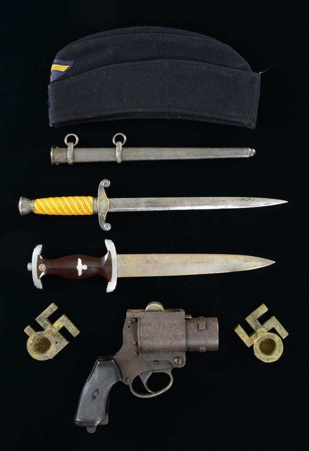 BRITISH FLARE PISTOL. 1) DAGGER. Army dagger measuring 14 3/4" overall. The blade is marked “(king) SMF SOLINGEN”. Plated eagle crossguard with oak leaf embellished pommel & ferrule. Light orange composite grip. No scabbard. CONDITION: blade shows some staining but no heavy oxidation. Mounts are tarnished but undamaged. 2) SCABBARD. A good example of an Army dagger scabbard that does not fit the above dagger. Scabbard measures 11 3/16” and has a plated finish with 2 support rings. CONDITION: scabbard has a dent at about its mid-point. 3) DAGGER. A composite post-WWII assembled SA dagger measuring 13 5/8” overall. Blade is etched “Alles fur Deutschland”. The blade is marked “B B&A A (in a cross within a circle) SOLINGEN”. Aluminum crossguard & pommel guard. Aluminum eagle with brown enamel “SA” button. Brown plastic grip. No scabbard. CONDITION: blade has staining & shows evidence of sharpening. Hilt shows light wear. 4) CAP. A Kriegsmarine side cap in black with a blue & yellow eagle at the front peak above a national cockade on blue. The inside of the cap is stamped “W 58”. CONDITION: light wear overall. 5) FLARE PISTOL. A deactivated British Webley & Scott No. 4 Mk1 aircraft flare pistol. Serial number 43266. CONDITION: pistol has an oxidized finish overall, and the catch has been removed, so the barrel will not remain closed. 6) CANDLESTICKS. A pair of 3 3/4" brass candlesticks that utilize a WWII German party symbol as a base. CONDITION: sticks have wear and patina but no damage. 7) BANNER. A German party banner measuring 38 1/2" x 55”. The 1-sided banner features a printed black party symbol on a sewn white disc all on a red field. The bottom of the banner has 2 1/2" cloth fringe. CONDITION: banner is solid but a bit stained. Fringe has yellowed. (02-21042-3/BF). $700-1,000.