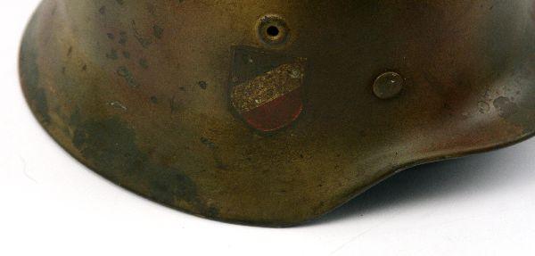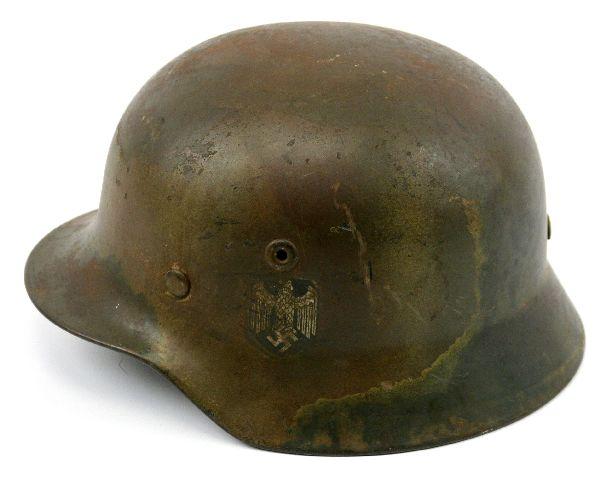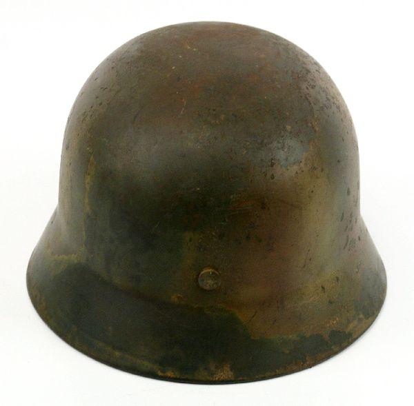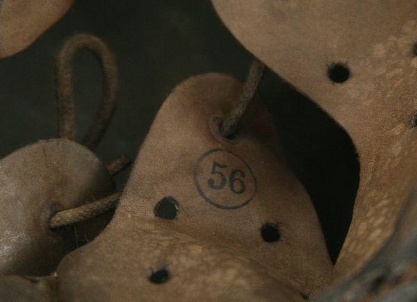 Camo painted rolled edge M40 with liner and chinstrap. Inside stamped Q64. Very good condition with some wear and oxidation and slight tears in leather.