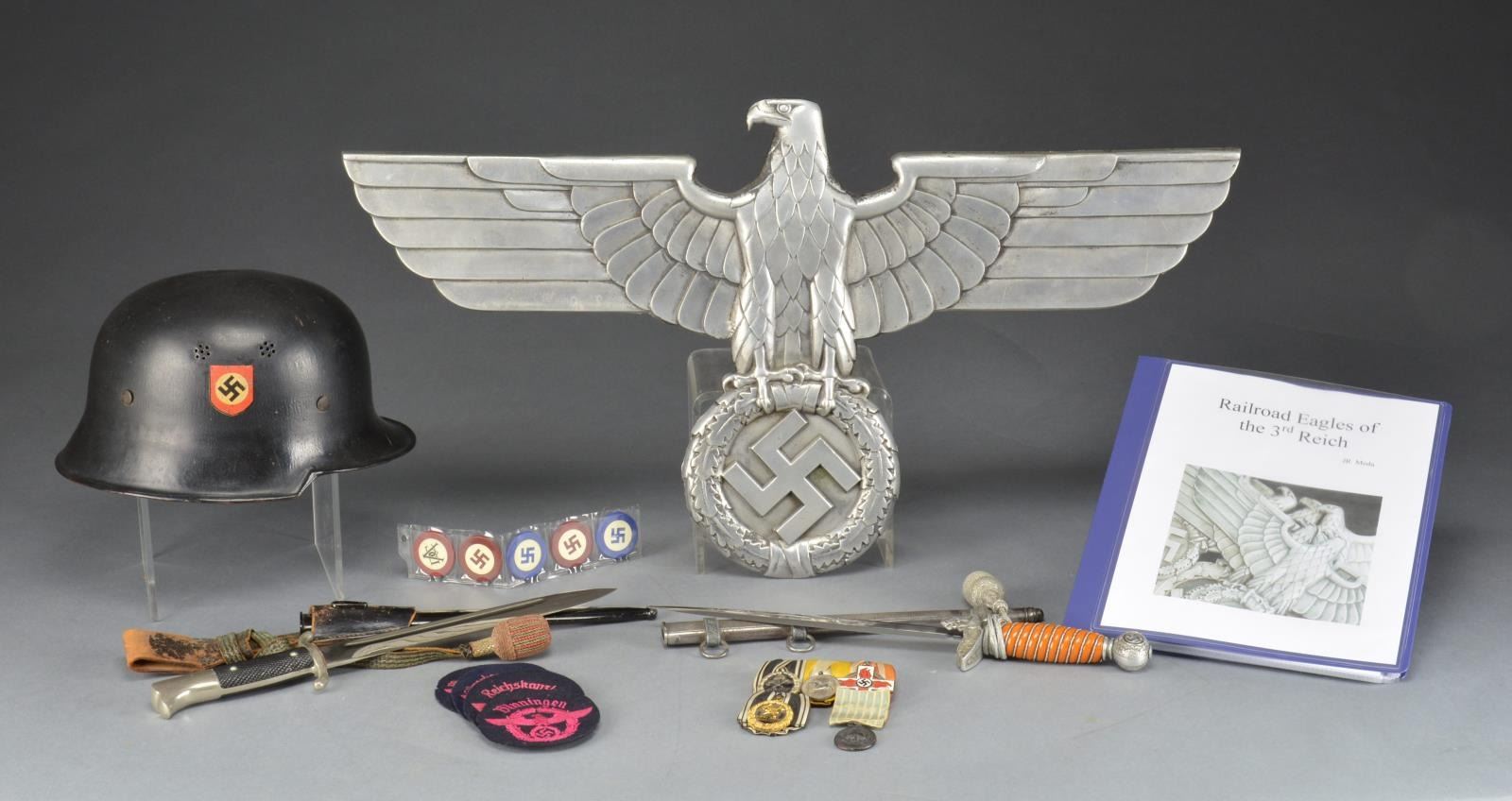 & MORE. 1) 2ND MODEL LUFTWAFFE DAGGER. Overall length: 17". Blade marked at the ricasso, “(knight’s head)WKC SOLINGEN”. Aluminum crossguard & pommel. Aluminum wire wrapped orange grip w/ portepee attached. Plated scabbard. CONDITION: blade shows original factory polish. Remainder of dagger shows light wear. 2) FIREMAN’S BAYONET. Overall length: 16". Single fullered, unmarked blade. Plated crossguard & pommel w/ 2 piece black composite checkered grips. Black enameled scabbard & black frog w/ fireman’s knot attached. CONDITION: blade shows original factory polish. Hilt & scabbard show light wear. Frog & knot show moderate wear. 3) CIVIL POLICE HELMET. A lightweight, double decal, black police helmet w/ two 7 hole vents on each side. Simple brown leather, 9 tongue liner w/ partial chinstrap. CONDITION: painted finish is 99%. Decals are 98%. Liner shows light wear except as noted. 4) POKER CHIPS. A group of 5 poker chips, 4 of which have Party symbols on both sides. CONDITION: light wear. 5) 4 POLICE PATCHES. Patches are for various precincts & are pink thread embroidered on black wool. CONDITION: patches show some moth damage. 6) MEDALS. 3 Award medal bar for a fireman including 2 pre-WWII Fire Service awards & an enameled WWII Fire Service Cross. / Single award medal bar w/ a gold plated Prussian 40 Year Fire Service medal. / 25 Year Fire Service medal. CONDITION: medals show light wear. Ribbons show moderate wear. 7) RAILROAD EAGLE. Lg. aluminum railroad locomotive eagle w/ a width of 28 3/4" & 15 1/2" in height. The rear of the eagle marked, “WAGEN 720 GAL-Mg-Si”. There is capture paperwork stuck to the back of the eagle stating in part that the eagle was captured December 22, 1943 by E.M. Allison. CONDITION: eagle has a distinctive casting & shows light wear overall. 8) BOOK. A loose leaf book on 3rd Reich railroad car eagles. CONDITION: like new. (02-13988/BF). $1,300-2,000.