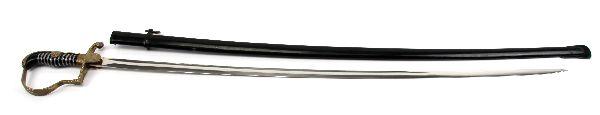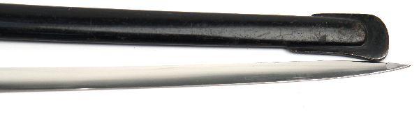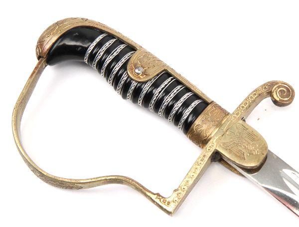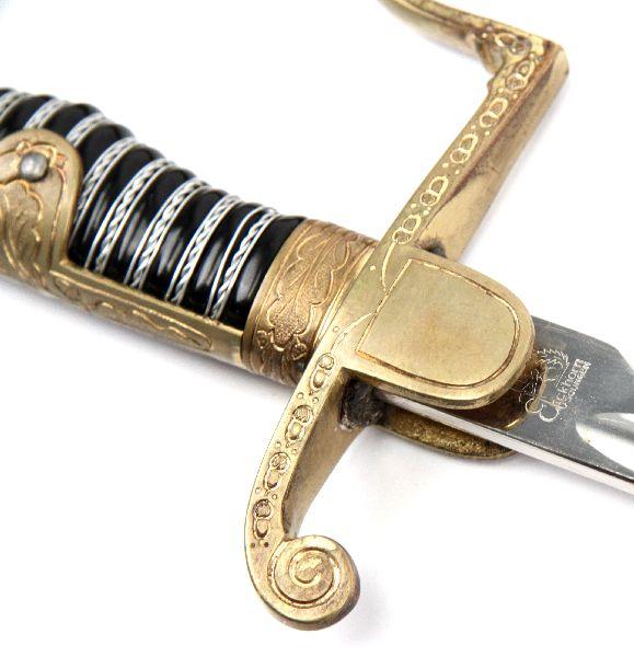33.5 inch fullered blade marked "Eickhorn Solingen" with squirrel emblem. Engraved closed-winged Wehrmacht eagle clutching swastika on one side of cross guard with engraved acorns and ok leaves. Black celluloid grip with tightly wound aluminum wire. Black rolled steel scabbard. Overall very good condition with some wear to gold finish of hilt and scratches to scabbard.