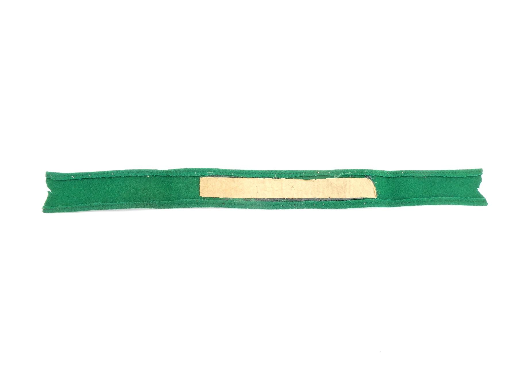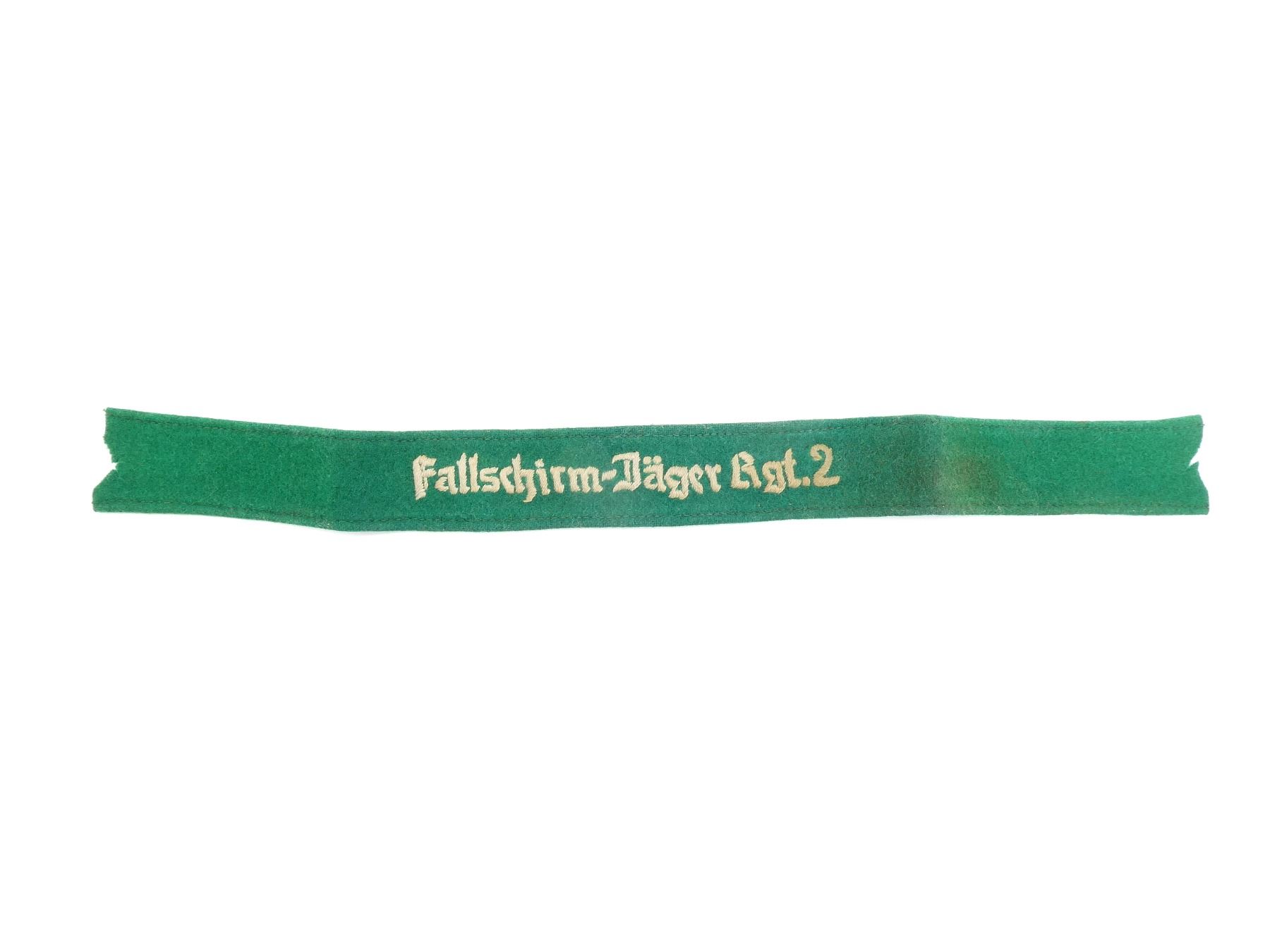 (1) GREEN WOOL ARM BAND MARKED: "FALLSCHIRM-JAGER RGT. 2", DOES NOT GLOW UNDER BLACK LIGHT, WIDTH APPROX. 1.5", OAL APPROX. 16.5". SEE PHOTOS.