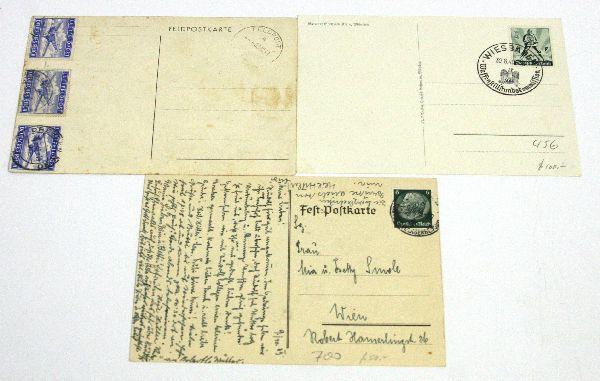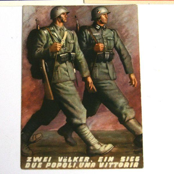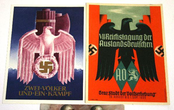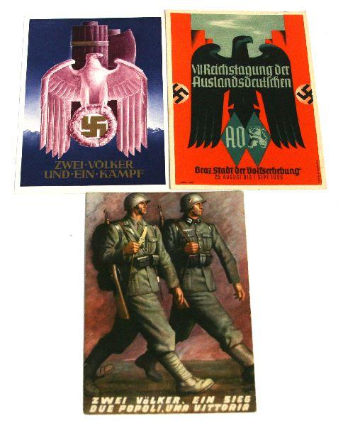 A rare postcard grouping consisting of 1939 Auslandsdeutschen card very good condition used and signed Heil Hitler, Fascist card "One People One Victory" cancelled very good, lastly Fascist Volker card , cancelled near mint.