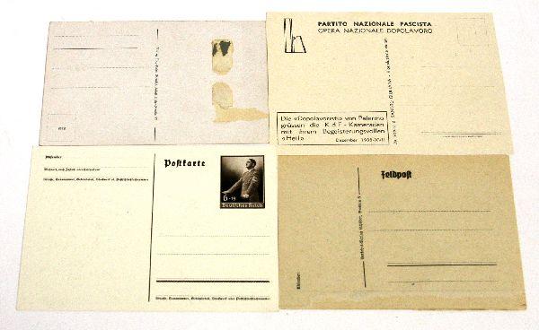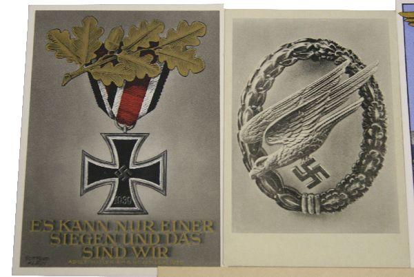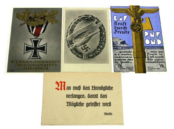 A group of 4 quite scarce WWII Third Reich propaganda postcards the lot includes, KDF Fascist Nazi freindship card 1938, near mint, Iron Cross card by Gottfried Klien, mint unused, Luftwaffe Paratrooper Badge card, some adhesive residue very good, and a final propaganda passage card, adhesive residue very good.