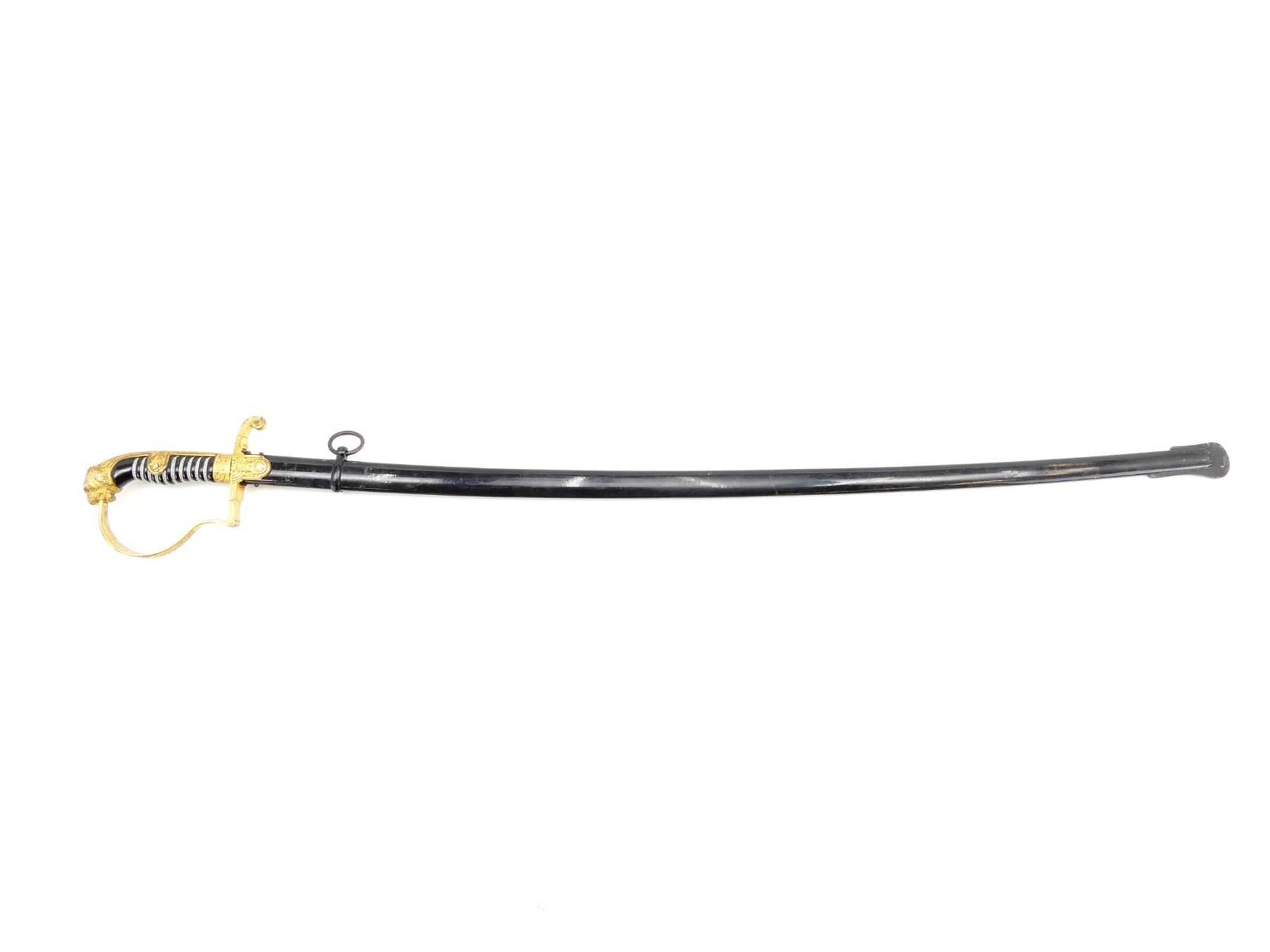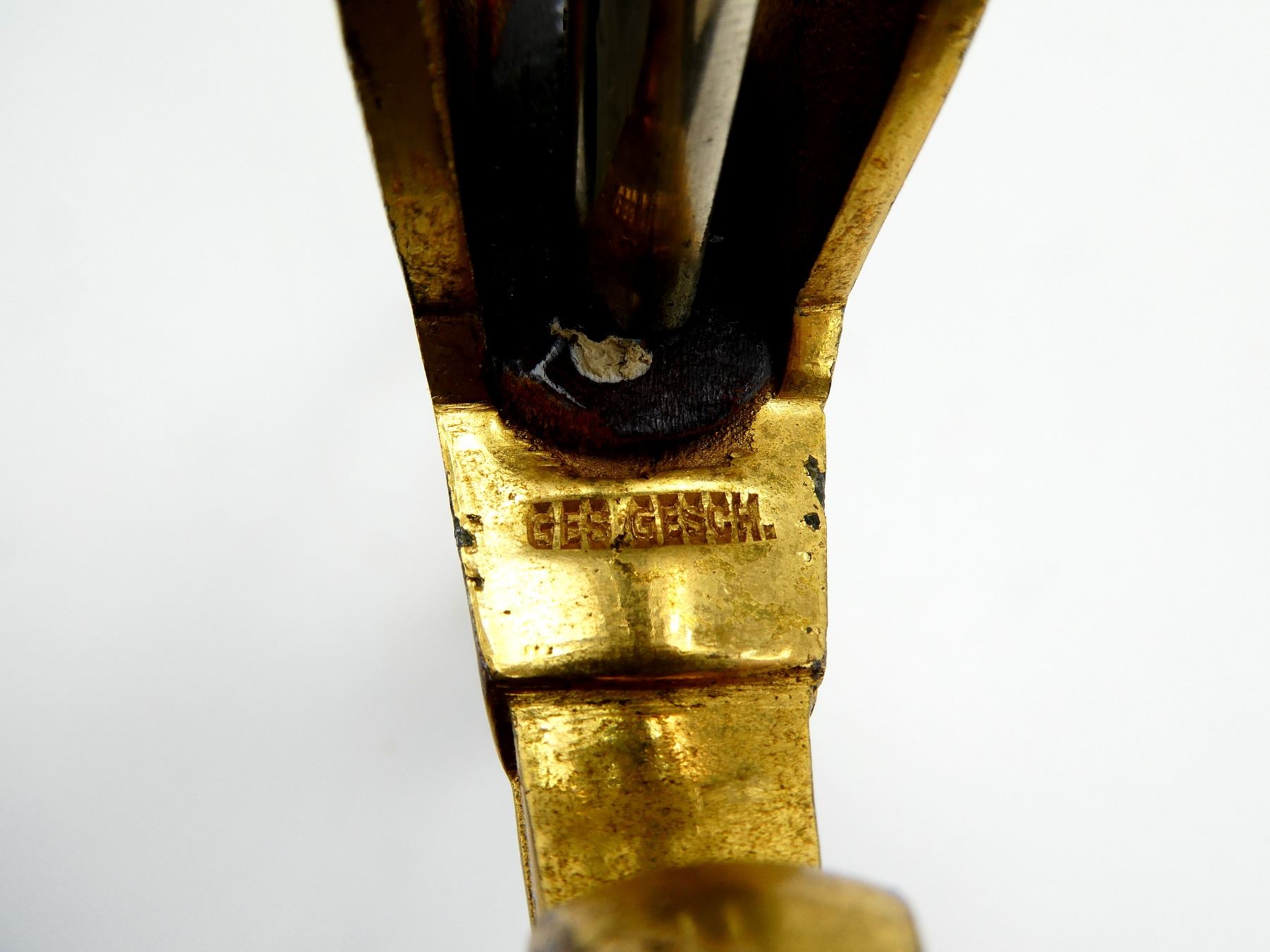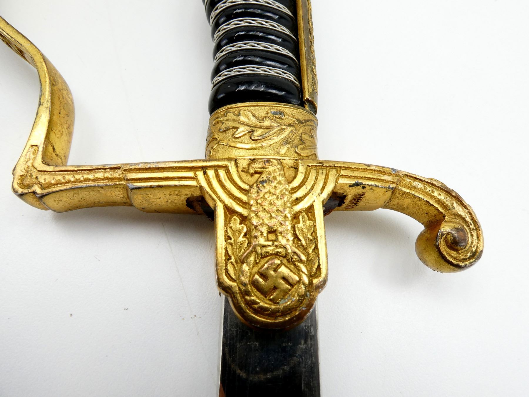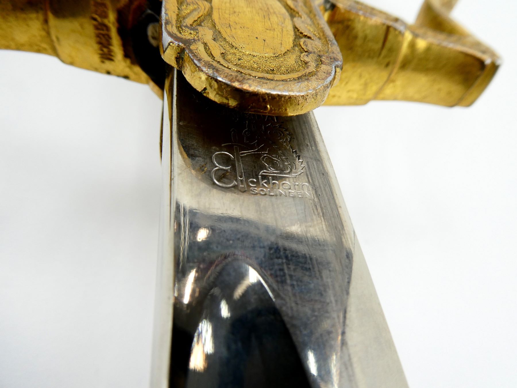 (1) SLIGHTLY CURVED SINGLE-FULLERED BLADE, RICASSO MARKED: "ORIGINAL" OVER SEATED SQUIRREL WITH SWORD OVER "EICKHORN" OVER "SOLINGEN", LEATHER WASHER / BUFFER PAD, BRASS CROSS-GUARD MARKED: "GES.GESCH.", FLYING EAGLE HOLDING SWASTIKA ON CROSS-GUARD, OTHER-SIDE HAS OAK LEAF & ACORN DESIGN, CROSS-GUARD HAS ENGRAVED / STAMPED DOTTED PATTERN TOWARDS THE ENDS ON EITHER-SIDE, OAK LEAF & ACORN PATTERN JUST ABOVE CROSS-GUARD (LOOSE / MOVES), BLACK TRIPLE WIRE WRAPPED GRIP, D-SHAPED HILT WITH OAK LEAF & ACORN DESIGN, BRASS LION'S HEAD POMMEL WITH RED EYES, OAK LEAF & ACORN DESIGN ALONG BRASS ON BACKSIDE OF GRIP, NO VISIBLE MARKINGS, BLACK PAINTED METAL SCABBARD, SQUARE LOOP STUD, ONE HANGER, NO VISIBLE MARKINGS, BLADE APPROX. 32" & OAL APPROX. 37". SEE PHOTOS.