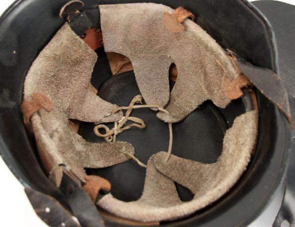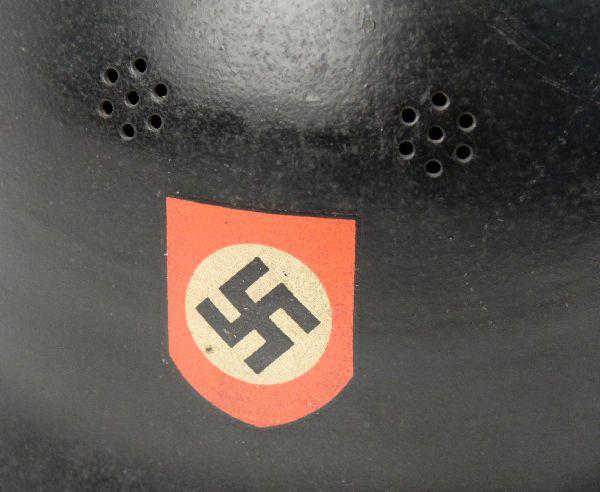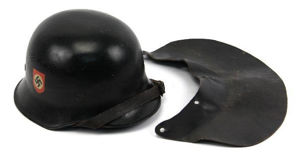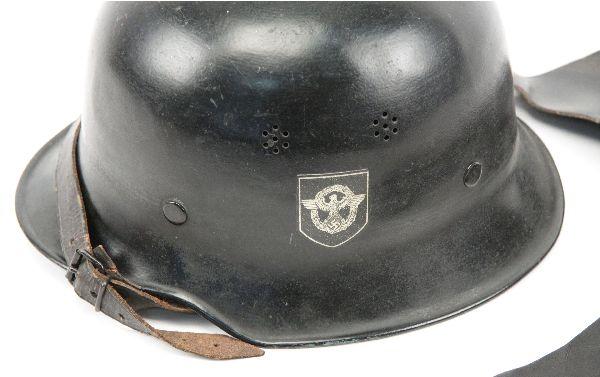 WWII German M-34 fire police helmet, with leather neck flap. Party shield decal on right, police decal on left. Leather liner and chin strap intact, and in good condition. Finish is very good, with very minor ding to front. Overall very good and complete condition.