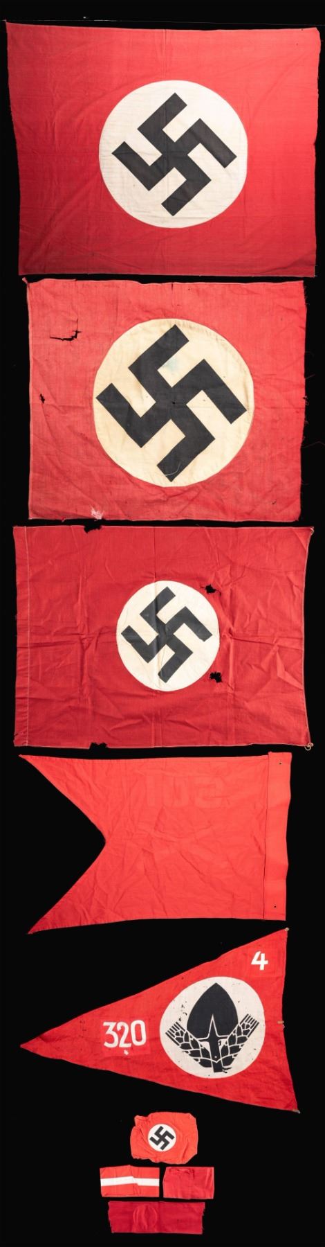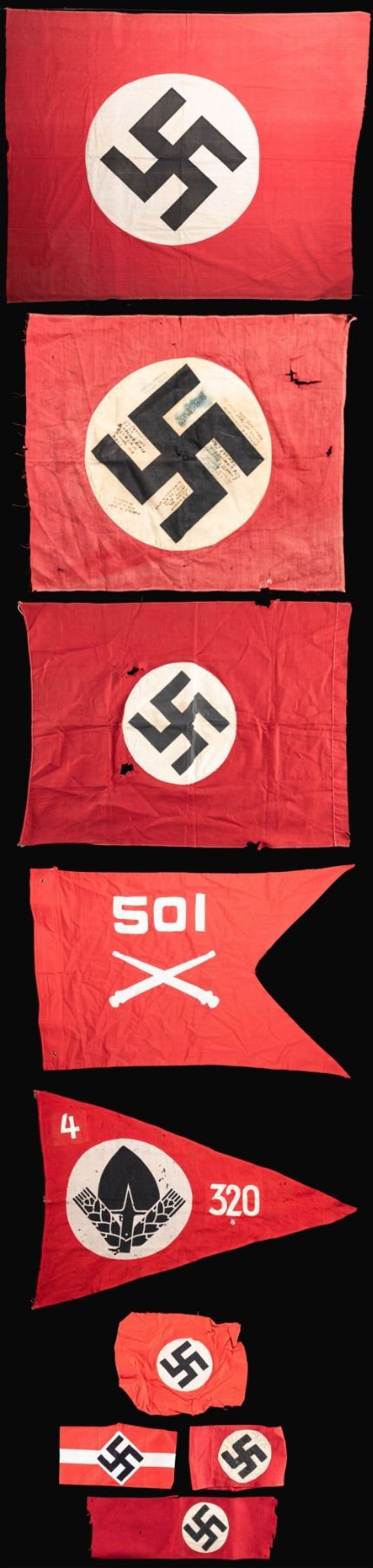 This lot of WWII German cloth items includes 1 HJ armband. / 1 Cotton Party armband. / 1 Wool Party armband (cut). / 1 Small Party flag measuring 9" x 7" (cut). 1 Party flag measuring 20" x 26" (with holes). / 1 Party flag measuring 22" x 18" (cut with a few holes) signed by seven soldiers of the 501st Field Artillery. Included with this trophy flag is a unit pennant from the 501st Field Artillery. / 1 RAD unit pennant measuring 27 1/2" x 44 1/2" showing the RAD insignia with a "4" above and "320" over "4" near the point. / 1 Part flag measuring 50 1/2" x 60 1/2" (2 torn edges). CONDITION: all items show wear but are solid and undamaged except as noted above. (02-24267-5/BF). NON-GUN. $400-600.