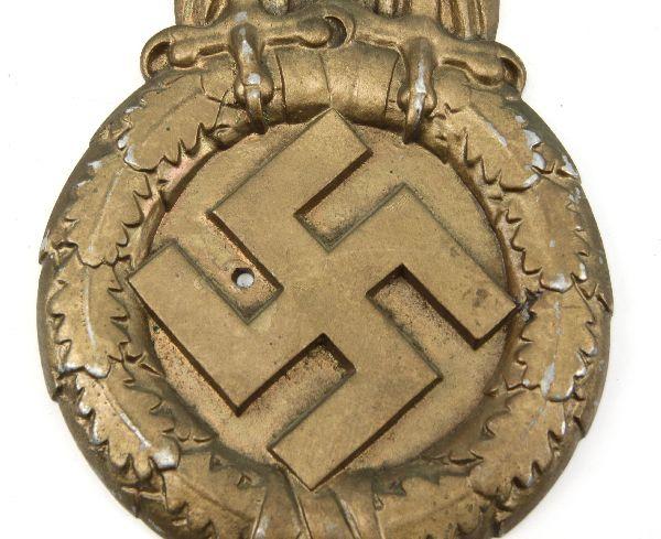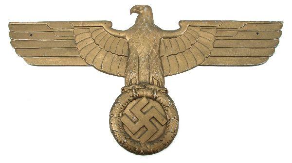 Large WWII German Nazi rail car party eagle emblem. Aluminum, with gilt finish, measuring 14 inches high, and 27 inches wide. Reverse side is marked "LOK / BLN / RZA 3" in middle "GAFM8-S" on back of right wing, and "G.P. / M." in circle on back of left wing. Overall very good condition.
