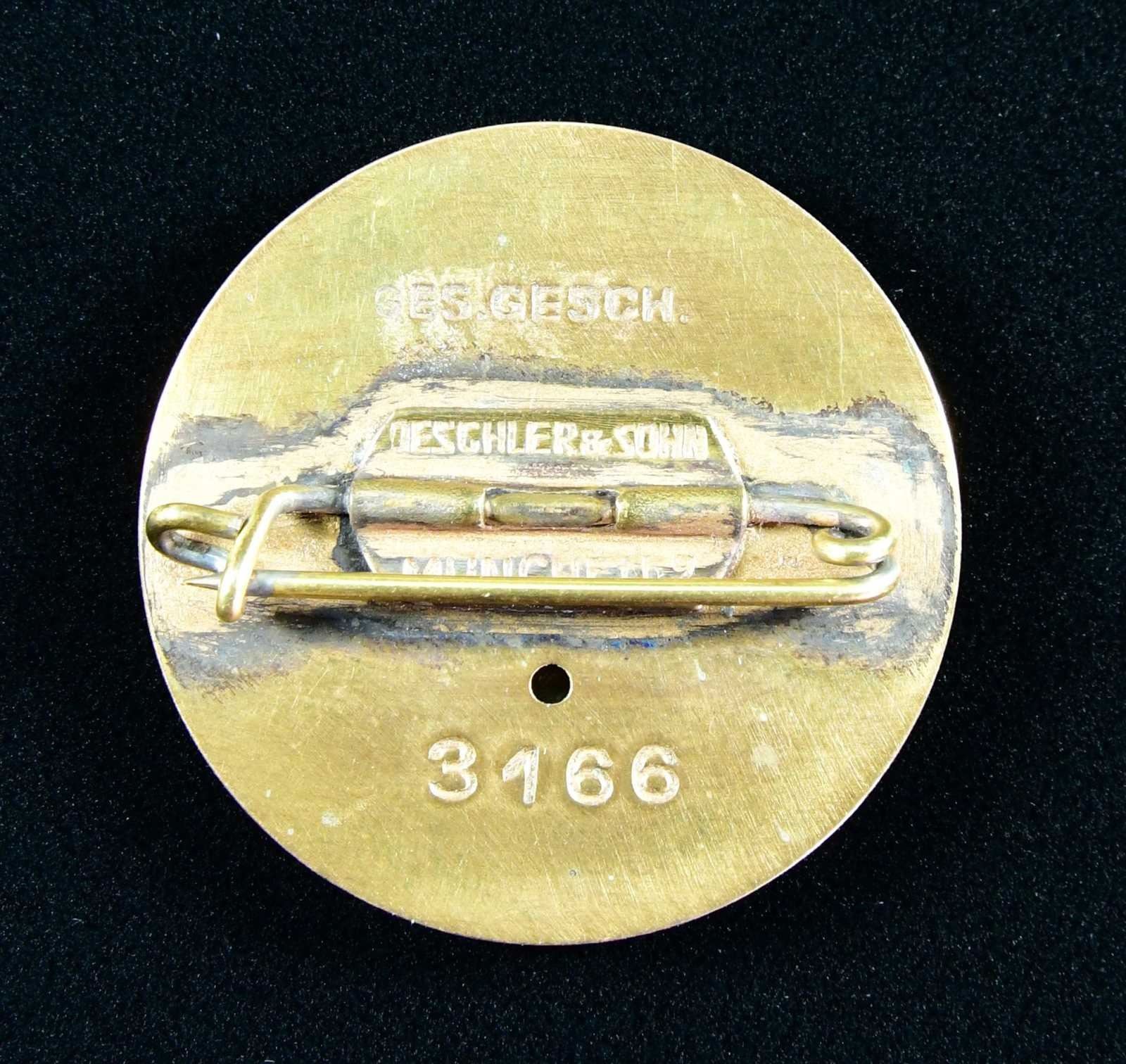 This very fine example of a WWII German gold party pin has a center of opaque white and black enamel with translucent red enamel. The center is surrounded by a golden wreath of oak leaves. The reverse has its original pin and is marked “GES. GESCH. DESCHLER & SOHN MUNCHEN 9. 3166”. CONDITION: there is virtually no damage to any of the enamel and little wear to the gold plating. PROVENANCE: from the collection of Joel Thone. (02-22531-1/BF). $1,800-2,500.