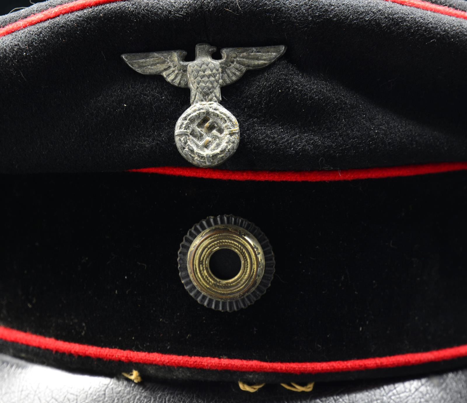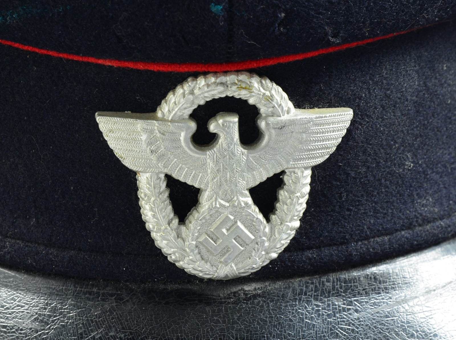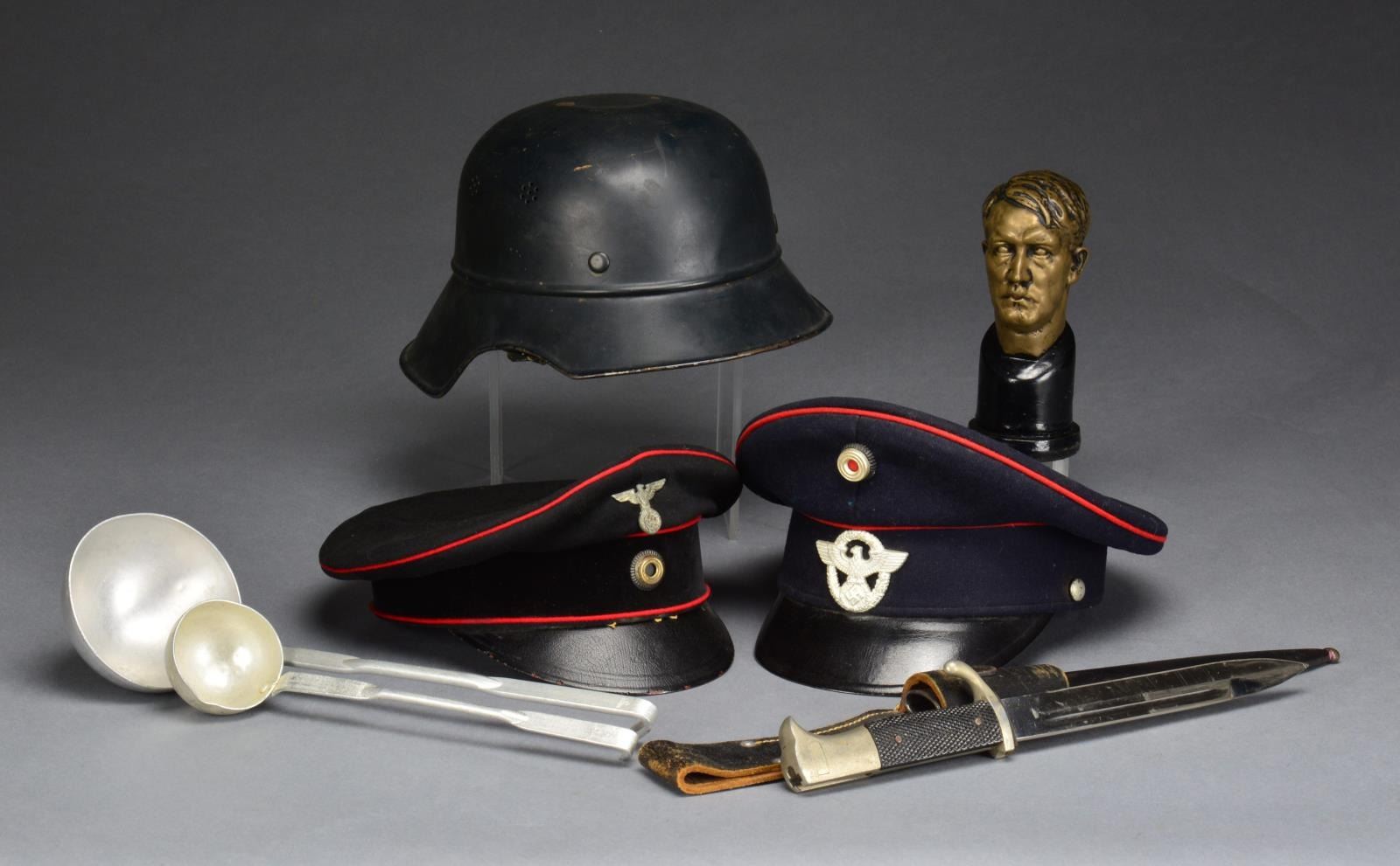 This lot includes a fire police peaked hat w/ dark blue body & band. Hat is piped in red w/ National Cockade over an aluminum police eagle & wreath on the front. Chinstrap is detached but present. Smooth finished side buttons. Sweatband & sweatshield present. / Early fire police peaked hat w/ black wool body & black velvet band. Hat is piped in red w/ Prussian cockade under early style Party eagle. No chinstrap. Sweatband intact. / Dark gray Luftschutze gladiator style helmet w/ a pair of 7 hole vents on each side. No decal on the front. Rear of helmet is stamped “RL 2 - 38/28” w/ a partial decal near the stamped mark featuring white lettered words & the size “58”. 6 Tongue liner w/ black chinstrap. / Lg. aluminum ladle w/ a Party eagle stamped at the top of the handle. / Sm. aluminum sauce ladle w/ a Kreigsmarine eagle over “M” stamped at the top of the handle. / Army dress bayonet, 17" overall w/ an 8 3/4" single fullered, unmarked blade. 2 Piece composite grips. Maker marked leather frog dated 1942. / 7" Bronze bust of Adolf Hitler on a black painted integral base. CONDITION: hats & helmet show light wear except as noted. Ladles also show light wear. Bayonet has a sm. chip at the top of 1 grip. Bust shows light wear & a mellow patina to the bronze. Base has minor scuffs. (02-14159/BF). $600-800.