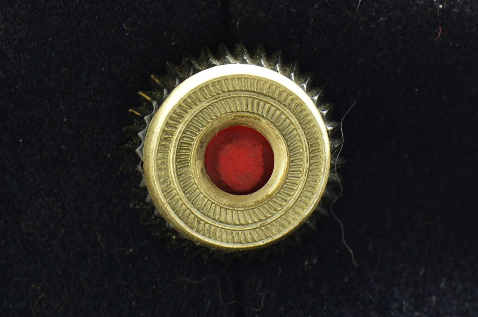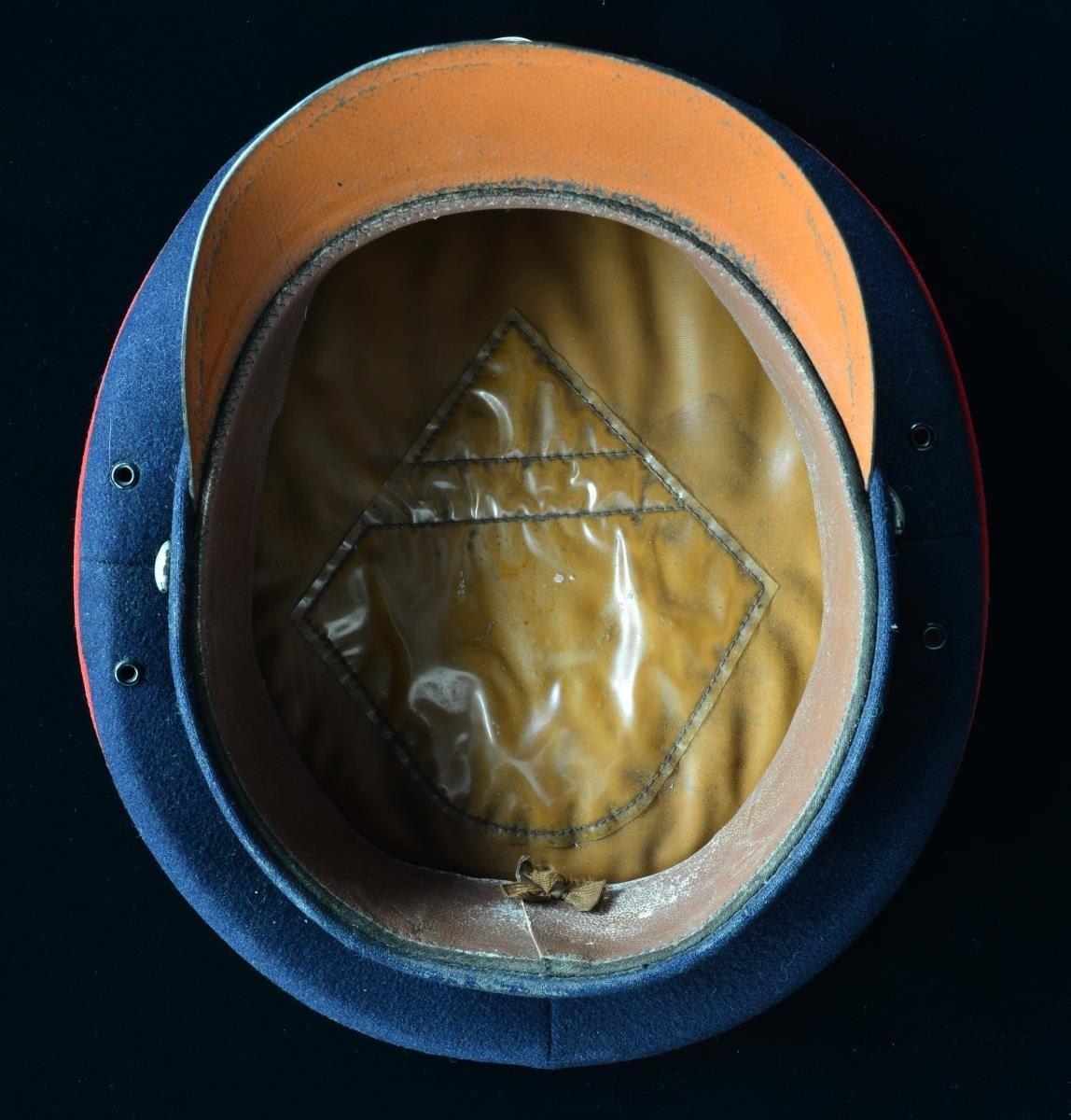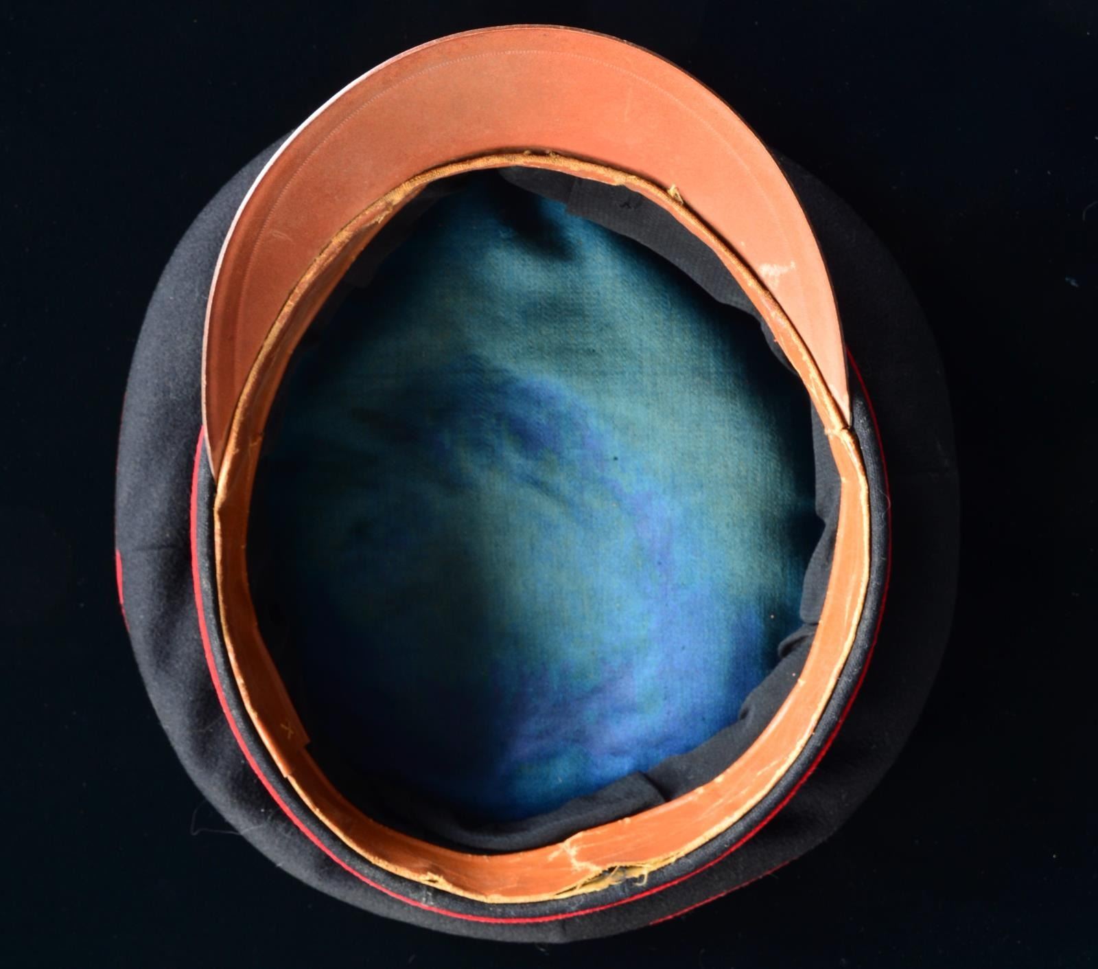 This lot includes a fire police peaked hat w/ dark blue body & band. Hat is piped in red w/ National Cockade over an aluminum police eagle & wreath on the front. Chinstrap is detached but present. Smooth finished side buttons. Sweatband & sweatshield present. / Early fire police peaked hat w/ black wool body & black velvet band. Hat is piped in red w/ Prussian cockade under early style Party eagle. No chinstrap. Sweatband intact. / Dark gray Luftschutze gladiator style helmet w/ a pair of 7 hole vents on each side. No decal on the front. Rear of helmet is stamped “RL 2 - 38/28” w/ a partial decal near the stamped mark featuring white lettered words & the size “58”. 6 Tongue liner w/ black chinstrap. / Lg. aluminum ladle w/ a Party eagle stamped at the top of the handle. / Sm. aluminum sauce ladle w/ a Kreigsmarine eagle over “M” stamped at the top of the handle. / Army dress bayonet, 17" overall w/ an 8 3/4" single fullered, unmarked blade. 2 Piece composite grips. Maker marked leather frog dated 1942. / 7" Bronze bust of Adolf Hitler on a black painted integral base. CONDITION: hats & helmet show light wear except as noted. Ladles also show light wear. Bayonet has a sm. chip at the top of 1 grip. Bust shows light wear & a mellow patina to the bronze. Base has minor scuffs. (02-14159/BF). $600-800.