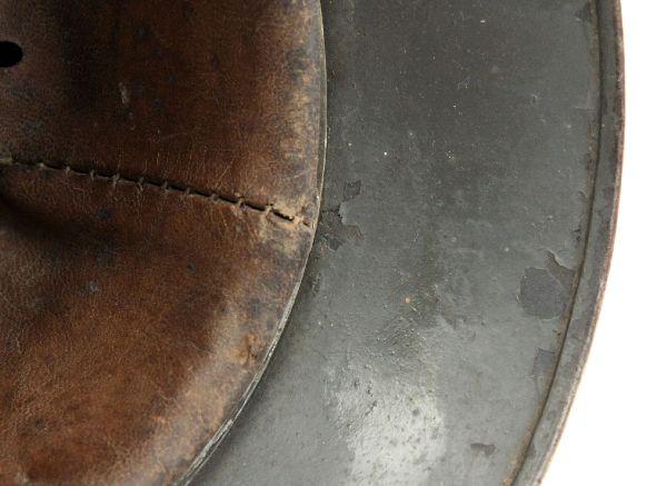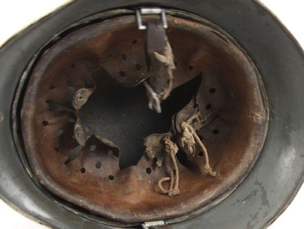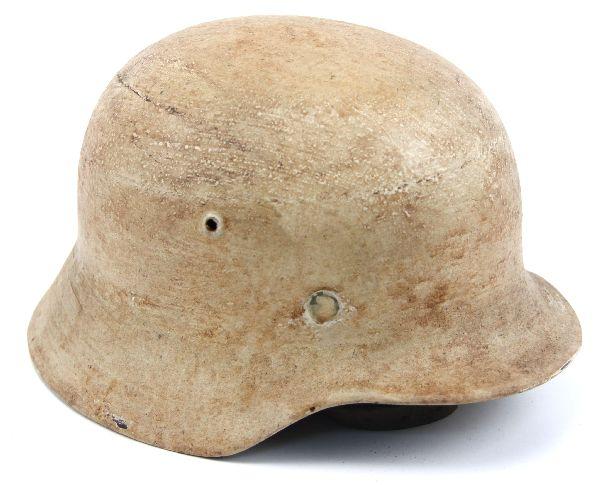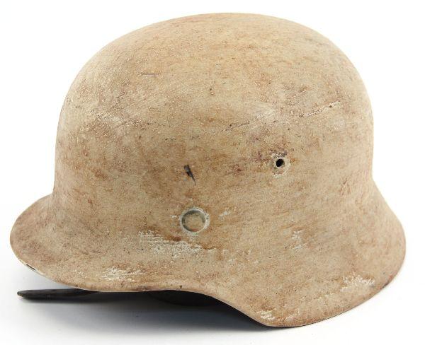 WWII German Heer M-40 helmet in snow camouflage paint. No decals. Serial number stamped in back inside rim "41118". Chinstrap marked "H. Erding 1939". Helmet is complete with liner. Liner in fair condition, with most of string missing, and leather brittle from age. Helmet shell is in very good condition, retaining most finish, and with no dents.