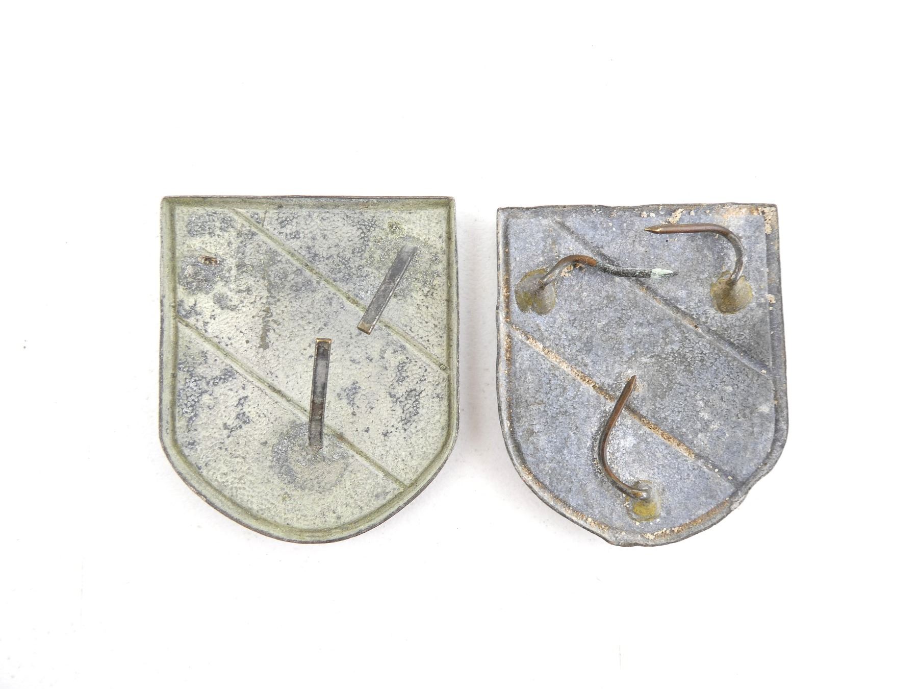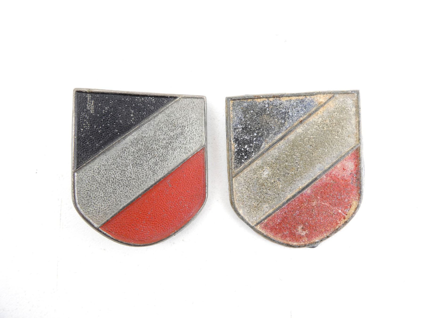 LOT INCLUDES; (2) HEER TROPICAL TRI-COLOUR AFRIKACORPS SHIELDS, NON-MAGNETIC METAL CONSTRUCTION, PIN BACKINGS, ONE HAS FLAT PINS, OTHER HAS ROUND PINS THAT APPEAR REPLACED / REPAIRED, NO VISIBLE MARKINGS. SEE PHOTOS.