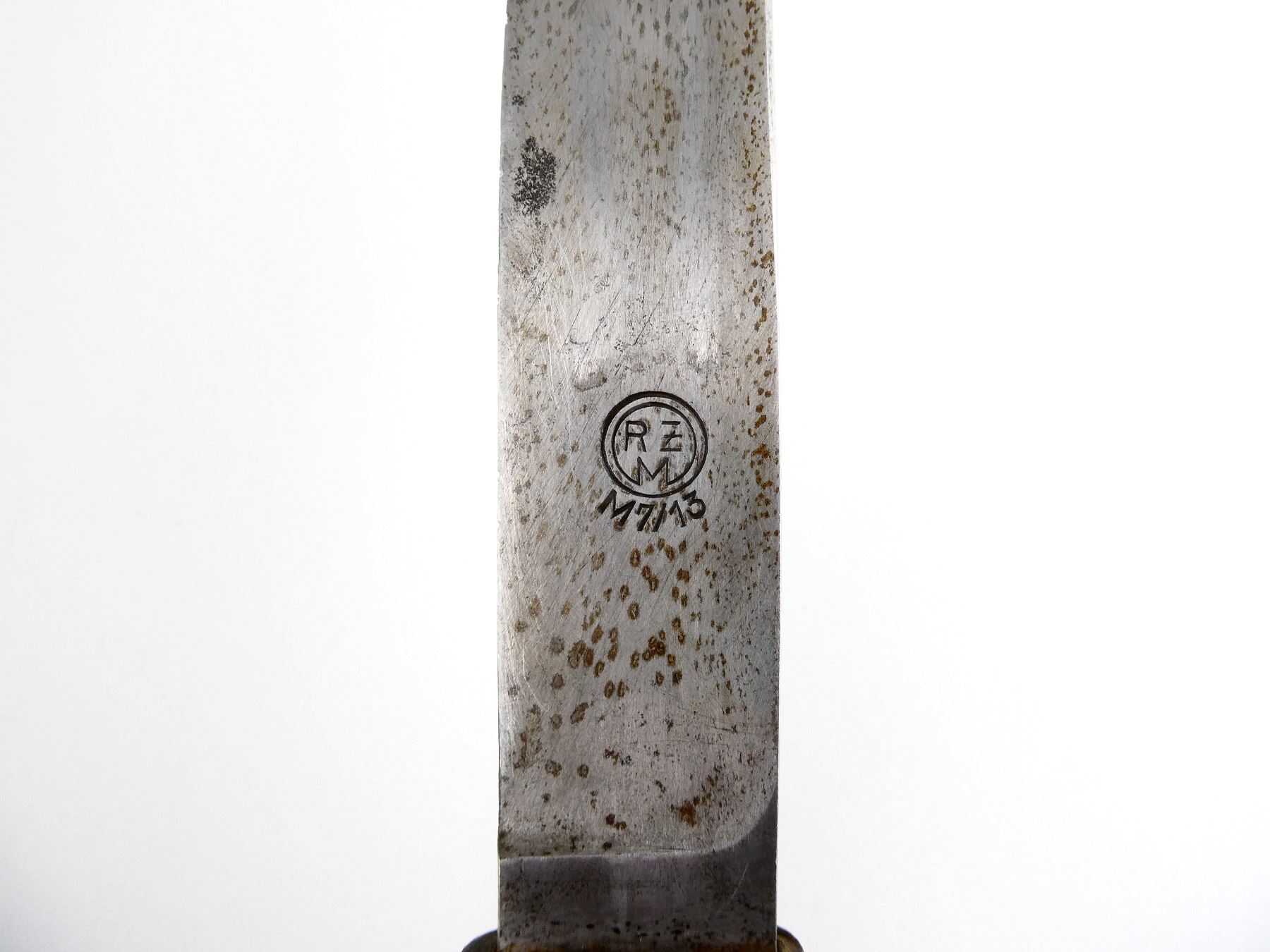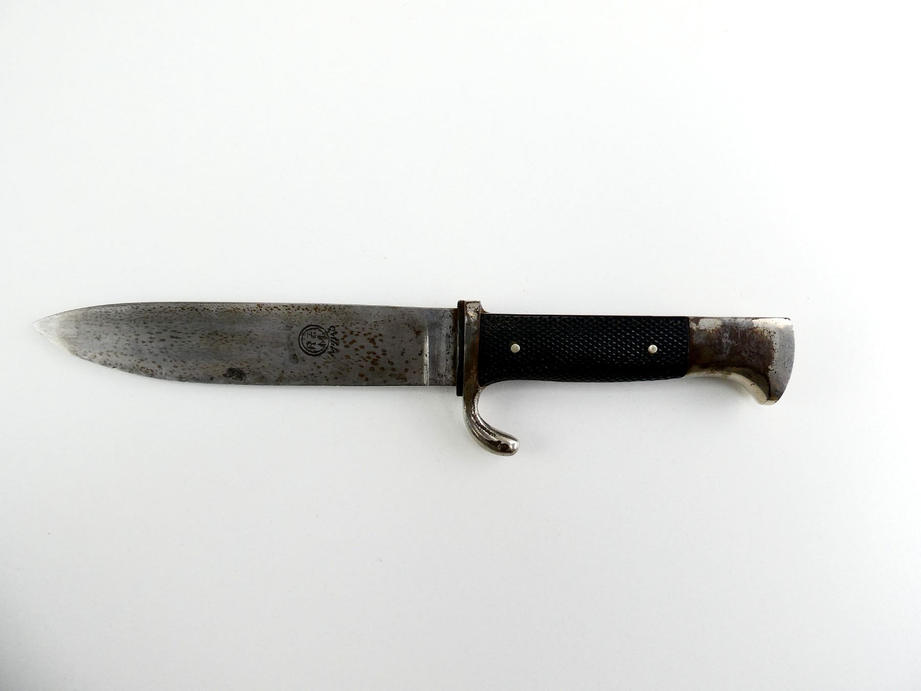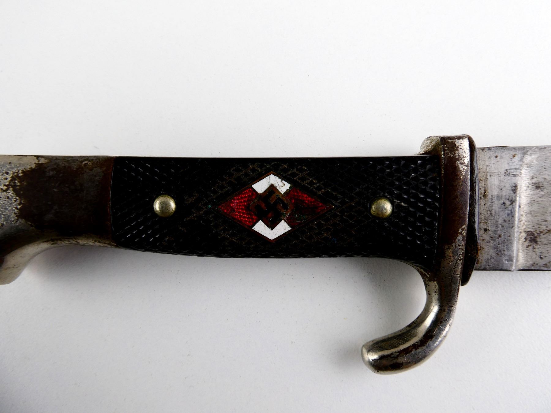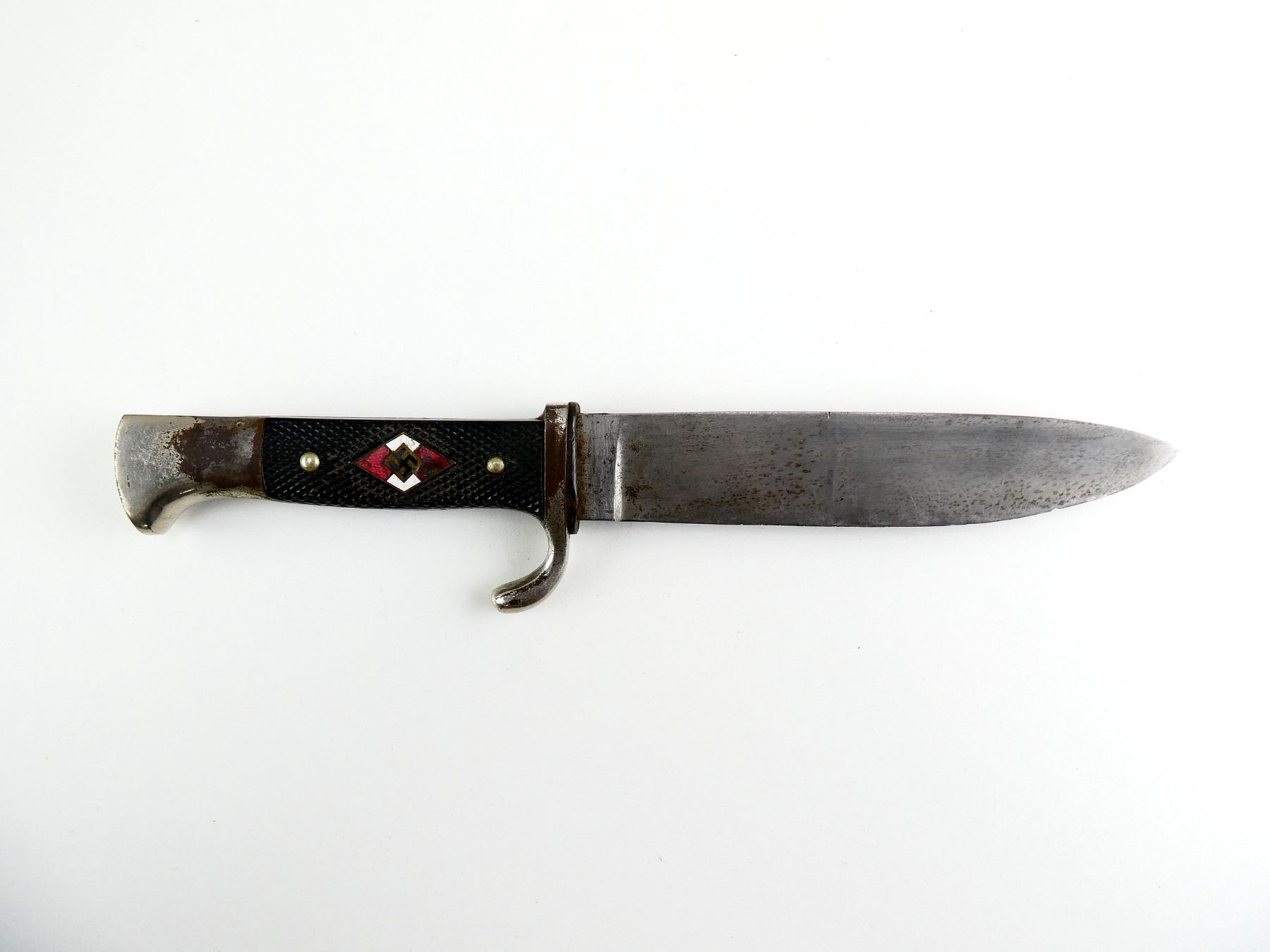 (1) HITLER YOUTH KNIFE, RICASSO MARKED: "RZM, M7/13", LEATHER WASHER / BUFFER PAD, 2-PIECE BLACK POLYMER CHECKERED GRIP, GRIP HAS RED / WHITE / BLACK ENAMELED DIAMOND WITH SWASTIKA, DIAMOND EMBLEM IS VERY LOOSE / MAY FALL OUT, DIAMOND APPROX. 25MM X 14MM, METAL POMMEL, NO VISIBLE MARKINGS, NO SCABBARD, BLADE APPROX. 5 5/8" & OAL APPROX. 9.75". SEE PHOTOS.