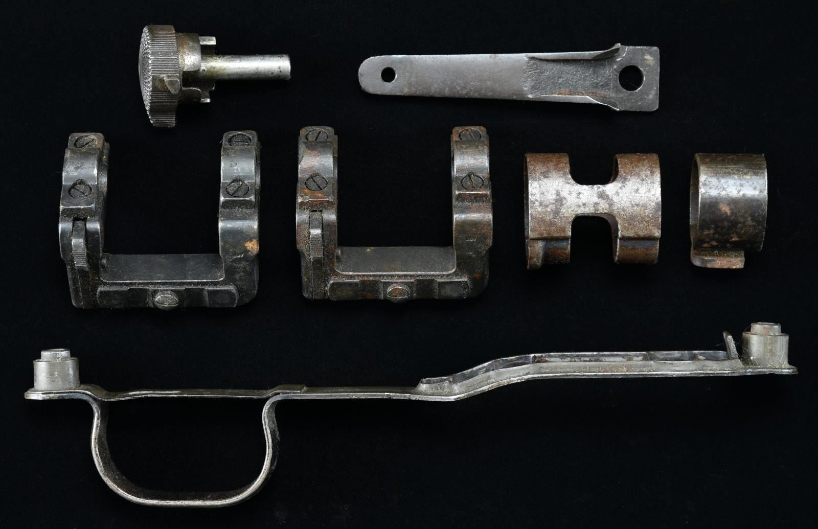 This group includes 1 trigger guard for a German G43. / 2 Rare scope mounts for a German ZF41 sniper scope. / 1 Bayonet band for a German Mauser 93. / 1 Front barrel band for a German Mauser 93. / 1 Japanese Arisaka safety knob. / 1 Arisaka receiver tang. CONDITION: all items show use but appear fully functional with expected patina. (02-19706-3/BF). $500-700.