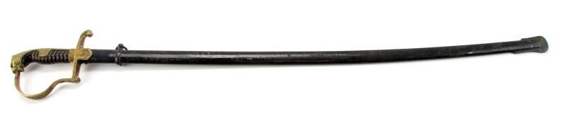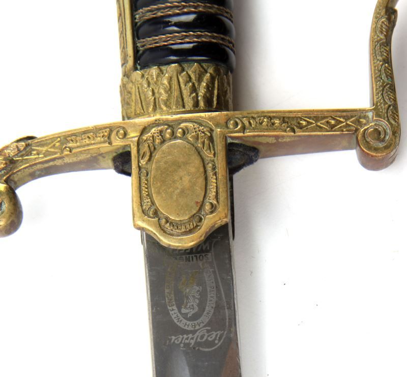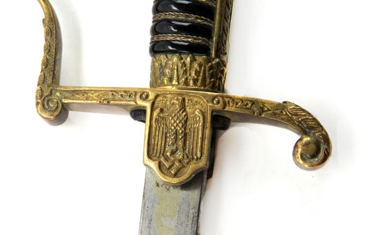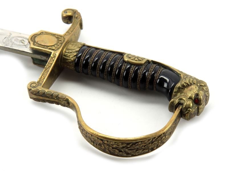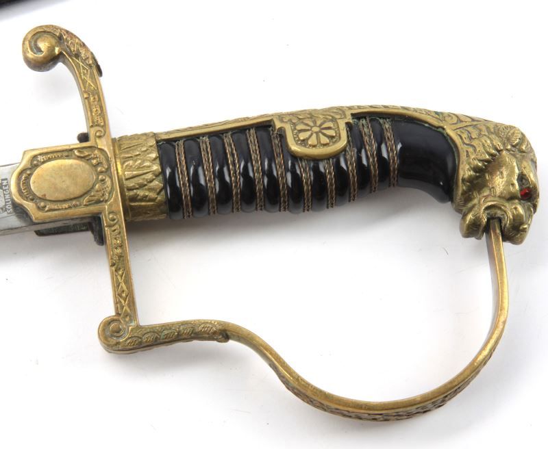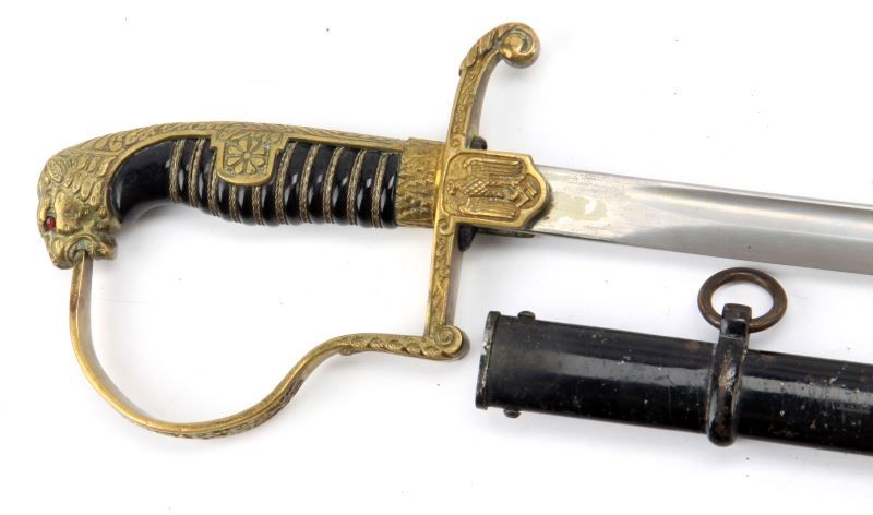 WWII German Lions Head sword, maker marked Ernst Pack & Sohne, Solingen, with logo on ricasso. Gilded hilt, with ruby eyed lions head pommel, wire wrapped celluloid grip, "P" knuckle bow, and national eagle on right langet. Rolled steel scabbard, with black enamel scabbard. Overall very good condition. This lot has a reserve.
