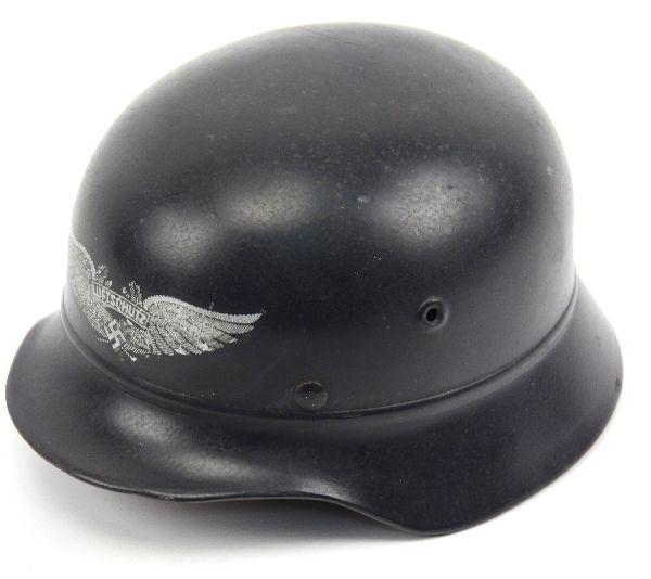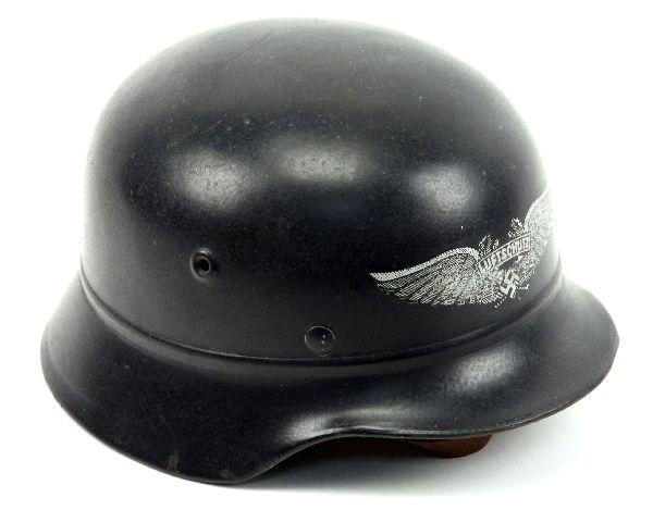 WWII German Luftschutz beaded M-40 helmet. Marked Q66, serial number T1238. Shell marked size 66, liner marked size 58. Helmet shell in very good condition, retaining 95% original finish. Liner and chin strap very good, missing string. Overall very good to excellent condition.