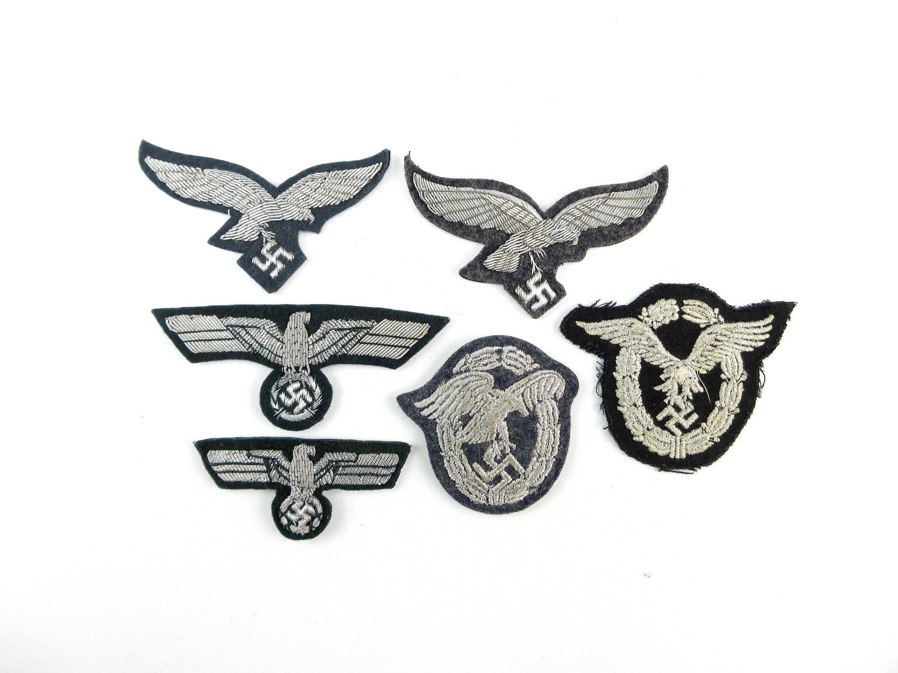 LOT INCLUDES; (2) THREAD EMBROIDERED TRADE BADGES ON WOOL BACKING, DOES NOT GLOW UNDER BLACK LIGHT, (2) WIRE EMBROIDERED CAP EAGLES ON WOOL BACKING, DOES NOT GLOW UNDER BLACK LIGHT & (2) WIRE EMBROIDERED JACKET EAGLES ON WOOL BACKING, DOES NOT GLOW UNDER BLACK LIGHT. SEE PHOTOS.