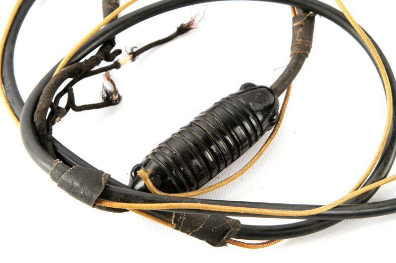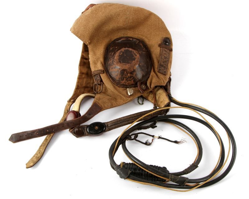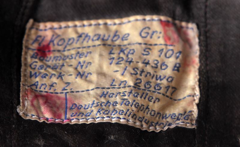 LPKS 101 Summer flight helmet with Bakelite throat microphone and cord, very good condition with moderate service wear, 3 mm tear midway left side front, original tag intact, This lot has a reserve.