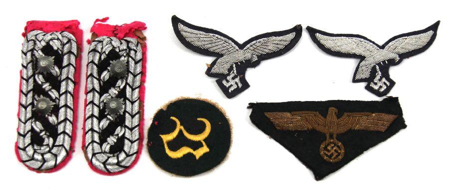 A useful grouping of Third Reich Insignia to include a General rank gold bullion bevo eagle, 2 silver bullion Luftwaffe Eagles, a pair of mothed police shoulder straps, and a administrators sleeve patch.